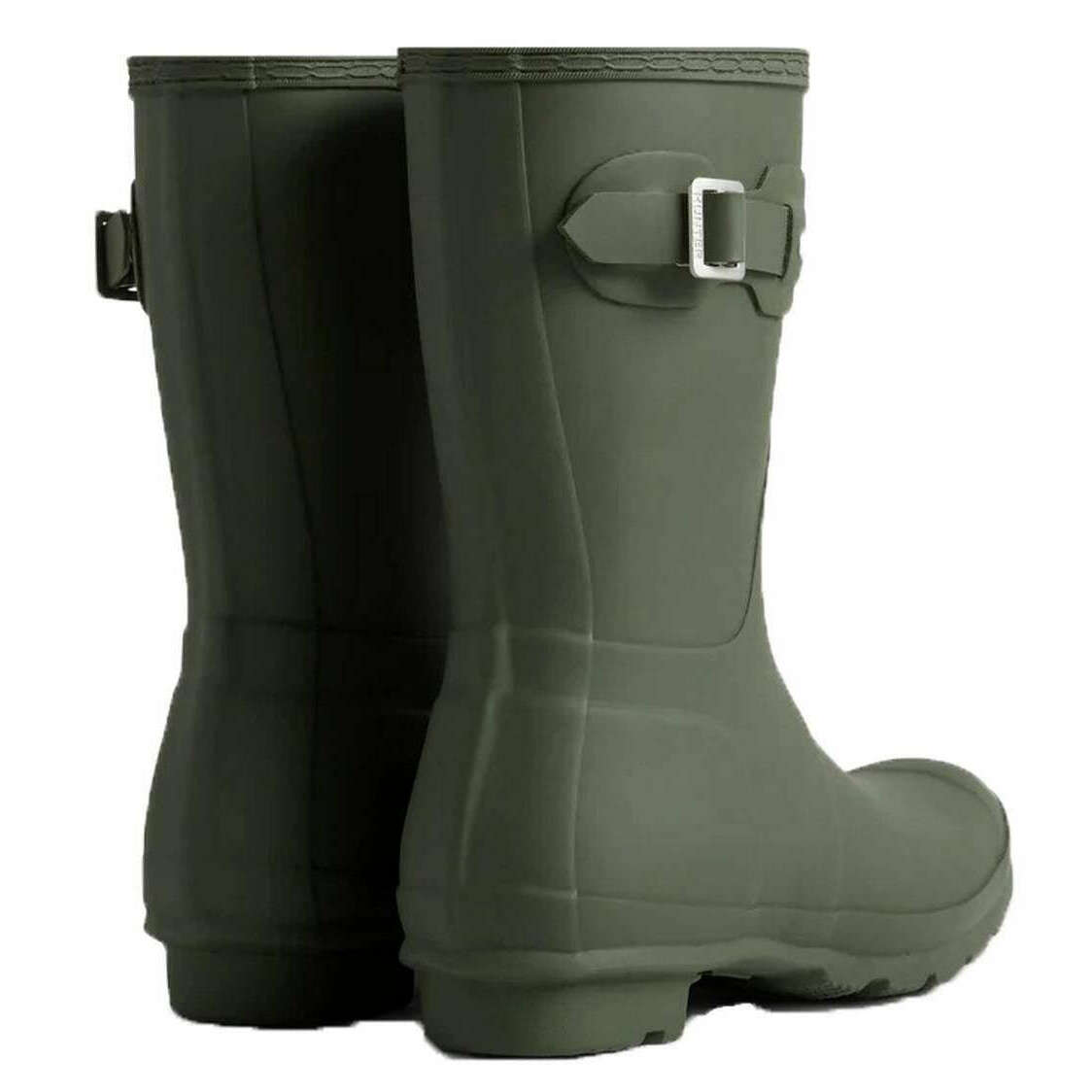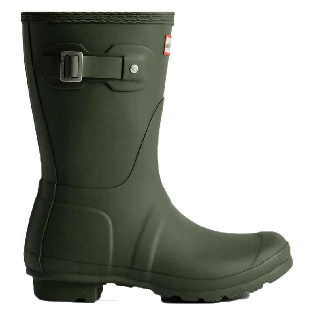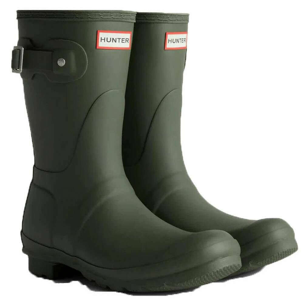 Manufactured from 100% rubber is this dark olive women's original short wellington boots by the designer Hunter. All the wellington boots come complete with hunter packaging. The Hunter Original Short Wellington Boots - Dark Olive offers a compact version of Hunter s iconic Tall Boot, designed for reliable wet?weather protection. Each pair is handcrafted from 28 natural rubber parts and assembled over three days before being vulcanised for durability and waterproof performance. The boot features a matte finish, the Hunter Original tread pattern, and an updated recycled polyester lining and insole for added comfort. Specially engineered to repel water and prevent moisture seepage, this certified vegan boot is an essential choice for rainy days.