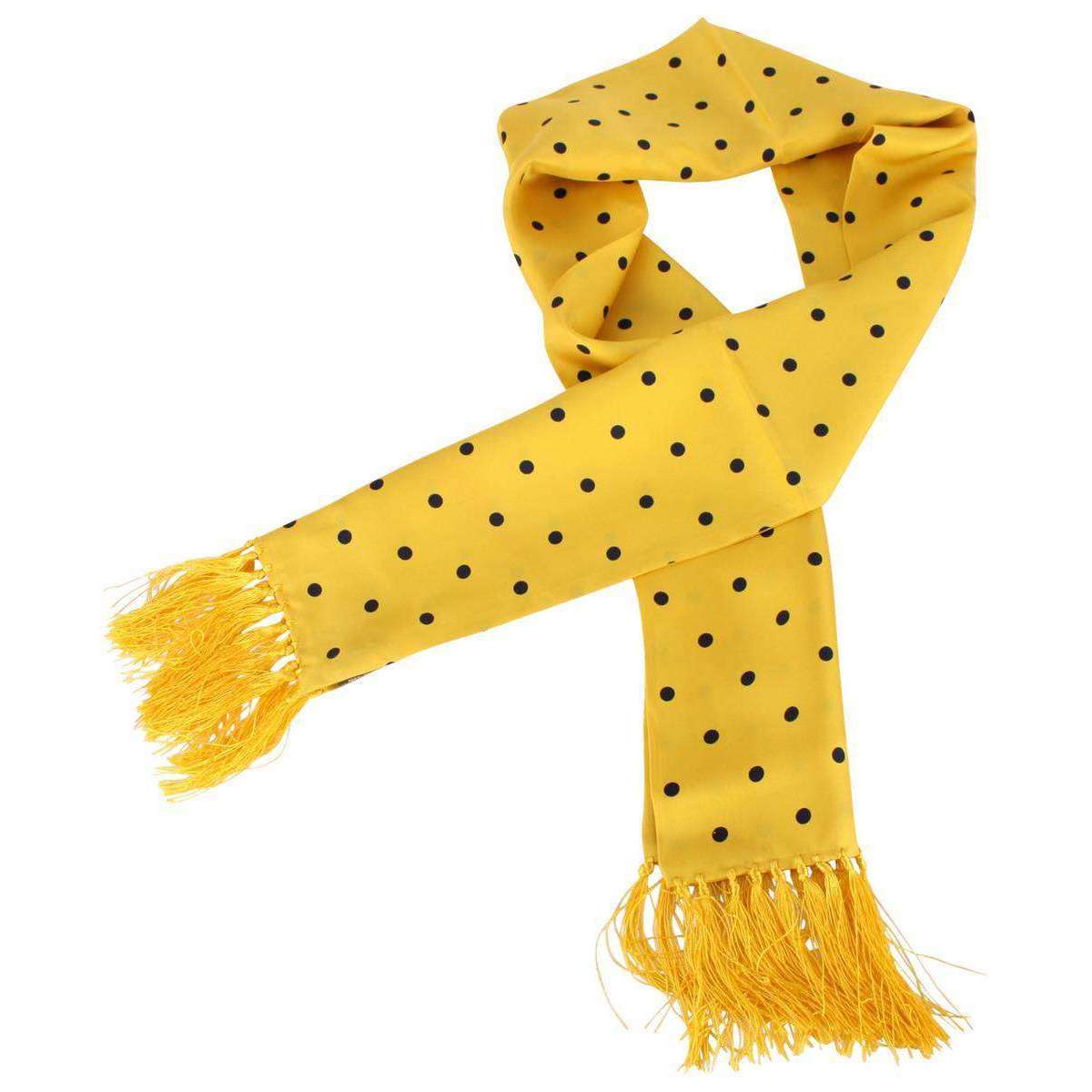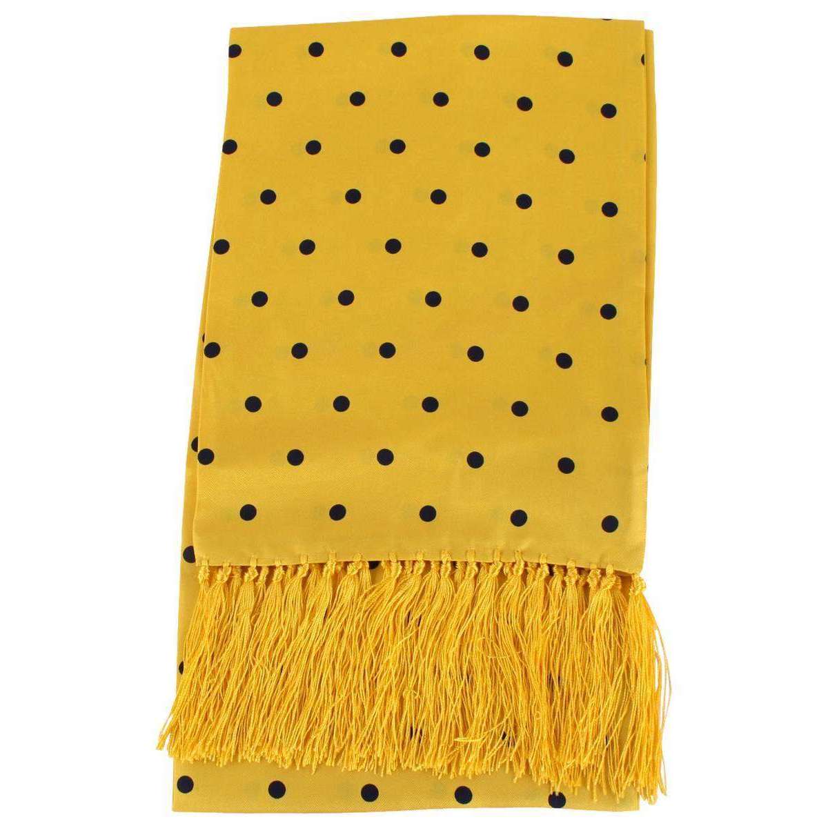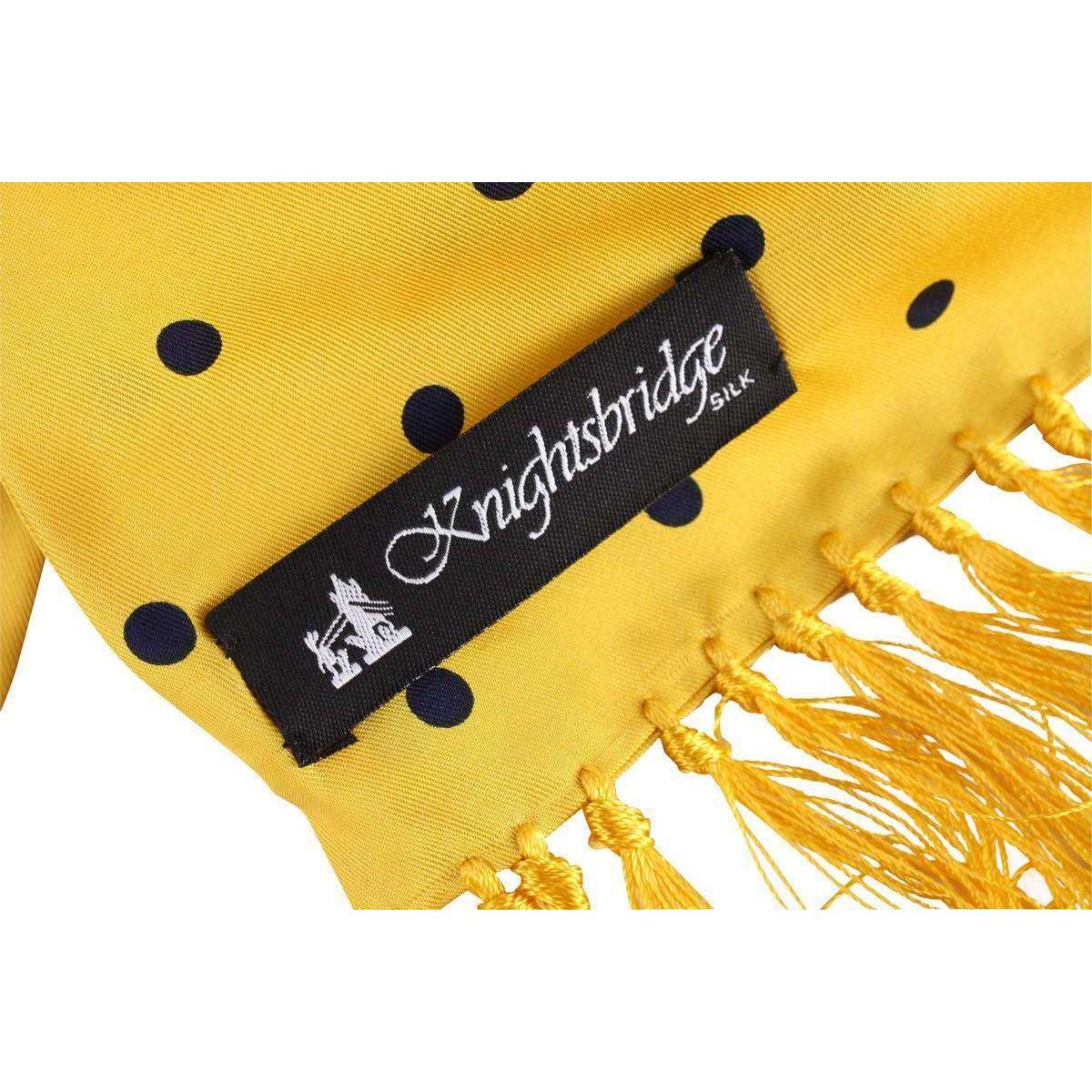 Knightsbridge Neckwear presents you with a truly wonderful scarf that is pleasing to the eye. Add delicate style to your formal attire as this dazzling neck piece features a fun polka dot design. The tassel at either end of the piece adds timeless appeal and flair ensuring that it is the perfect dress scarf. Wonderfully crafted from 100% of the finest of silk, this Knightsbridge scarf is certain to be soft to the touch providing you with the utmost comfort. The contrasting colour of navy polka dots upon a yellow background compliments this scarf beautifully making it a truly magnificent gift idea.