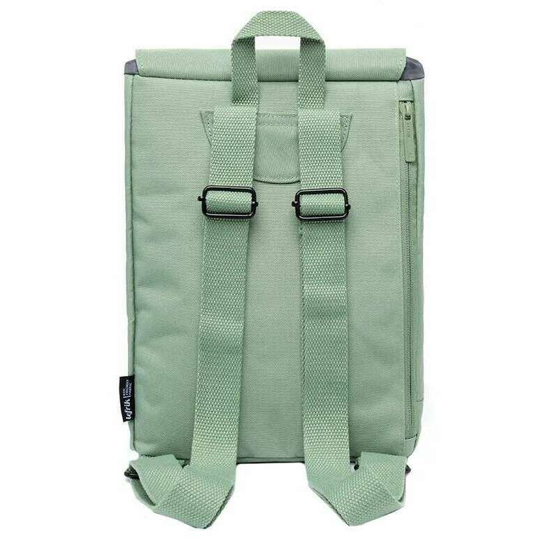 Perfect for men or women is this Lefrik sage green kaut mini backpack, it is also made from 100% vegan oxford rpet fabric. It measures 30cm(height) x 22cm(width) x 13cm(depth). All the bags come complete with lefrik packaging. The Lefrik Kaut Mini Backpack - Sage Green is the mini version of the iconic Kaut model, featuring a large main compartment and a separate pocket for notebooks or small electronic devices. Perfect for school, work or play, this backpack is lightweight and water resistant. The quick access pocket on the flap and security pocket on the back allow you to store small items comfortably. With just the right amount of space, this vegan and sustainable backpack is designed for convenience.