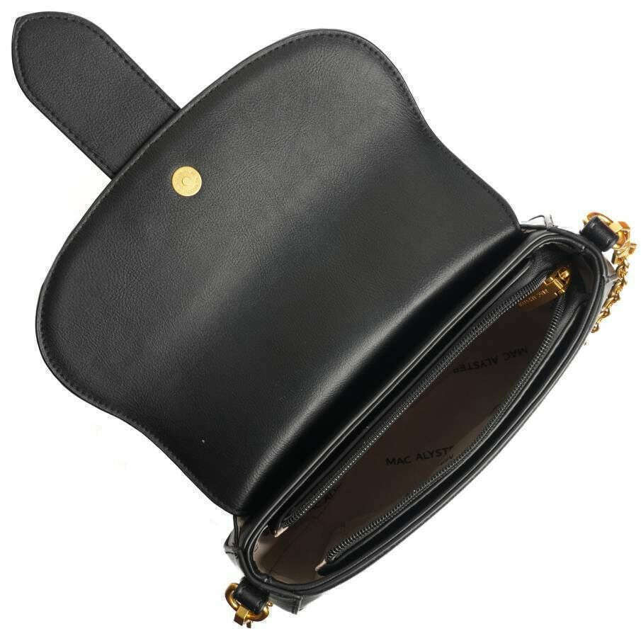 • Magnetic Flap Closure , Zipper Closure , Detachable Adjustable Strap , Detachable Chain Strap , Interior Zipper Pocket , Interior Slip Pocket , Studs on Base , Gold Hardware , Mac Alyster Branding , Dust Bag Included