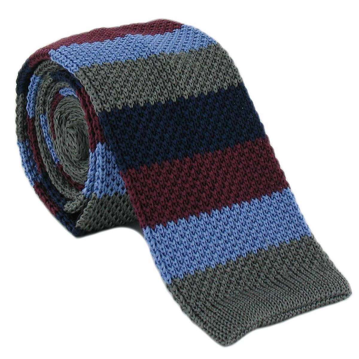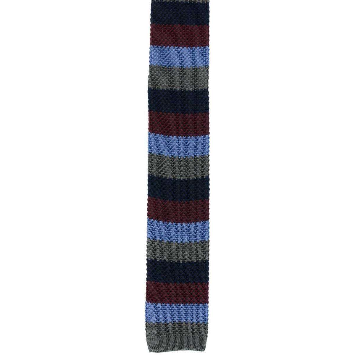 Quality silk knitted skinny tie with grey, blue, red and black stripes by luxury men's accessory designer Michelsons of London.