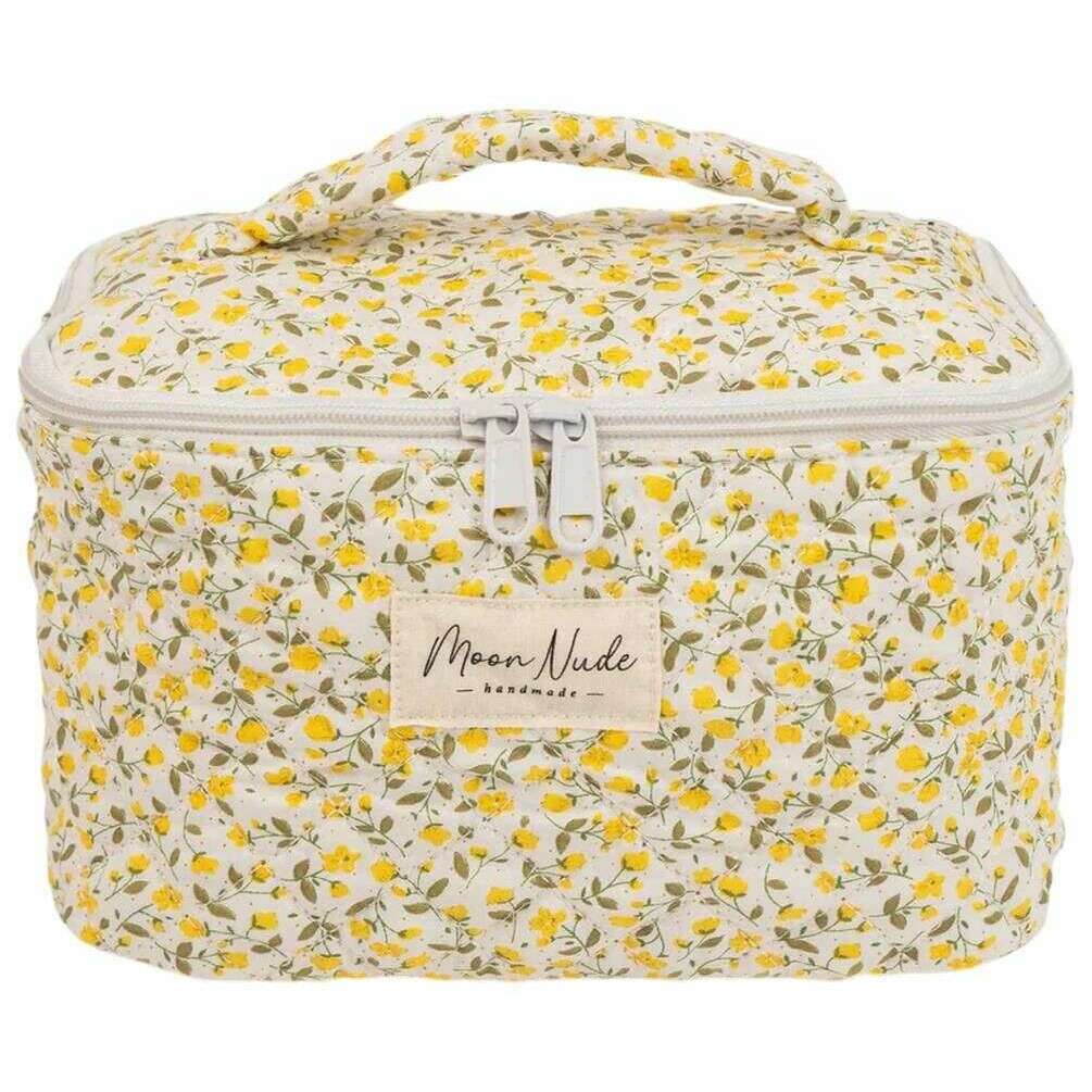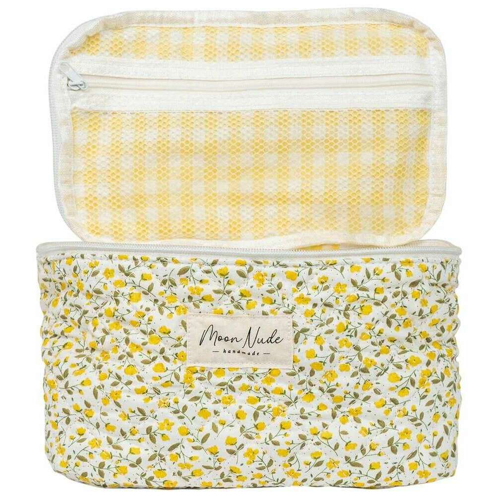 This women's buttercup vanity bag by the brand Moon Nude is made from 100% cotton and is showcased in white. It measures 16cm(height) x 22cm(width) x 14cm(depth). It is recommended to wash by hand in cold water with a mild detergent, or maching wash inside out on a delicate cycle. to keep this bag in good condition. All the bags come complete with moon nude packaging. The Moon Nude Buttercup Vanity Bag - White/Yellow is an absolute necessity for travelling or everyday use. This vanity bag is guaranteed to keep all your makeup or skin care in one place, whilst also being stylish and fashionable with its handmade quilted design.