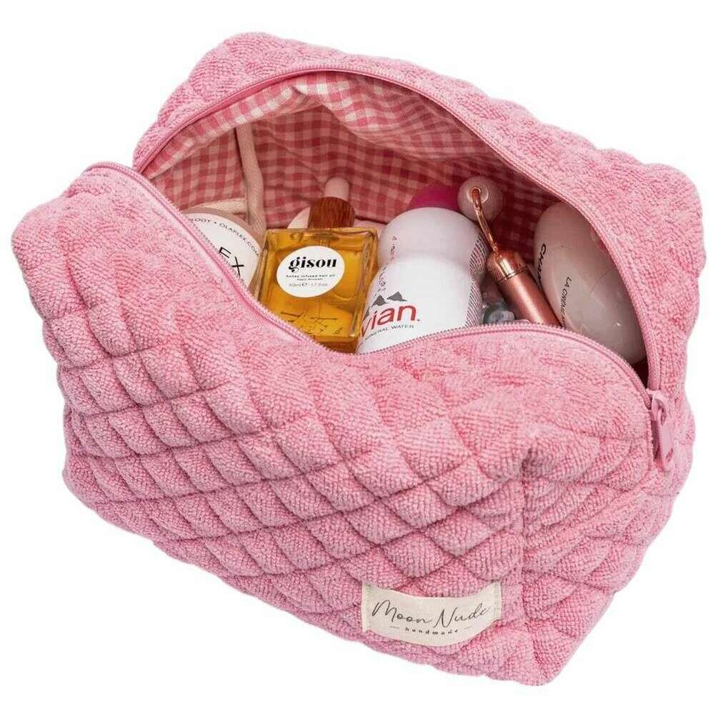 This candy large makeup bag for women is fashioned by the brand Moon Nude in a pink colour and is made from 100% cotton. It measures 15cm(height) x 25cm(width) x 15cm(depth). It is recommended to wash by hand in cold water with a mild detergent, or maching wash inside out on a delicate cycle. to keep this bag in good condition. All the bags come complete with moon nude packaging. The Moon Nude Candy Large Makeup Bag - Pink is an absolute necessity for your room or everyday bag. This makeup bag is guaranteed to keep all your most used products together and safe, whilst also being stylish and chic with its handmade quilted design.