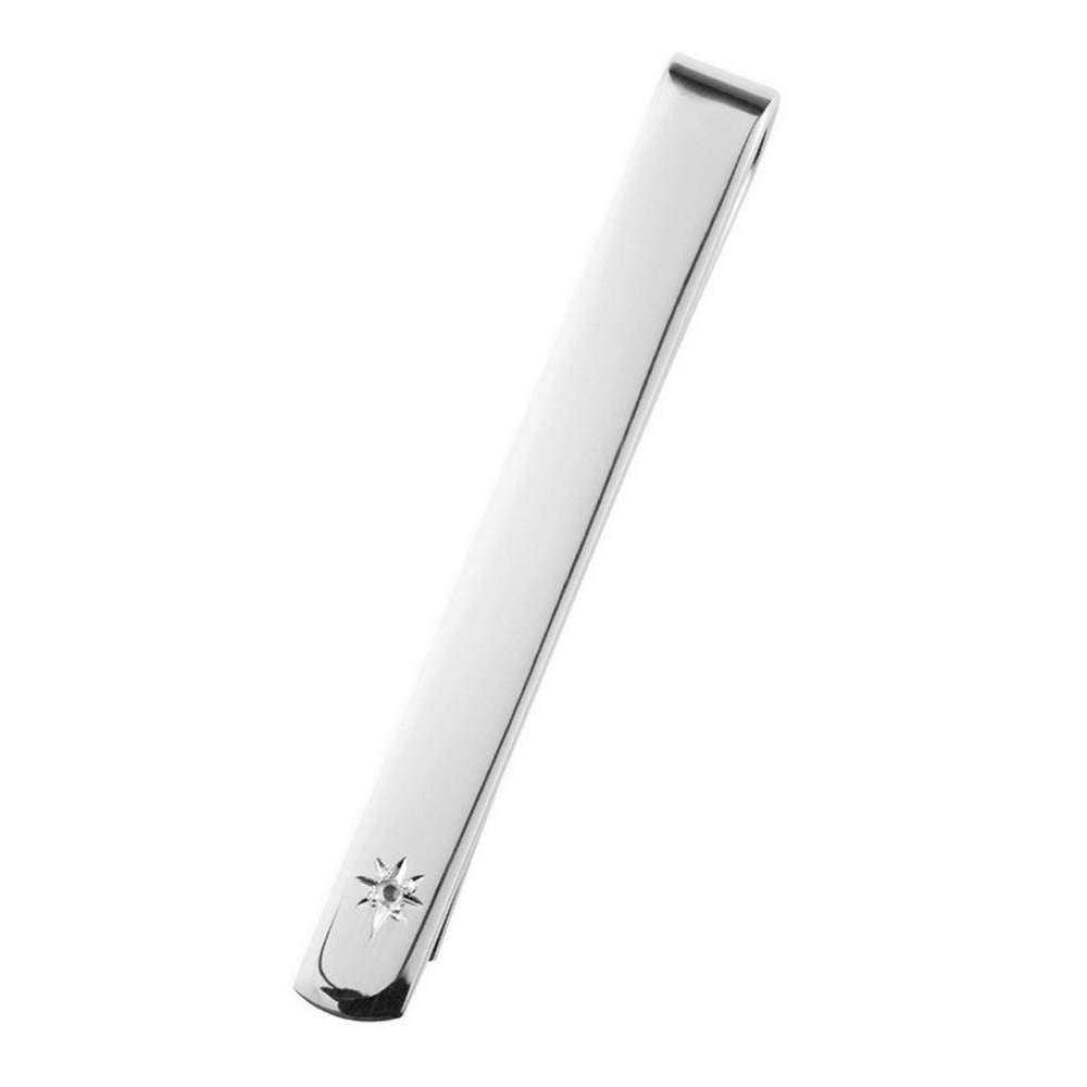This men's diamond set tie bar has been made from sterling silver, featured in a silver colour and is from the brand Orton West. It measures 5.6cm(length) x 0.65cm(width). All the tie slides come complete in a presentation box. The Orton West Diamond Set Tie Bar - Silver adds a touch of sparkle to your attire. This has been manufactured with a diamond at the bottom of the tie bar for simple yet stunning overall design.