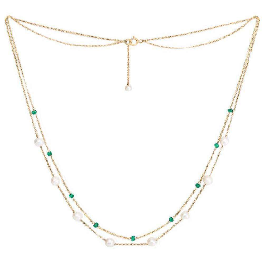 Pearls of the Orient Fine Double Chain Freshwater Pearl and Emerald Necklace - Green /White/Gold