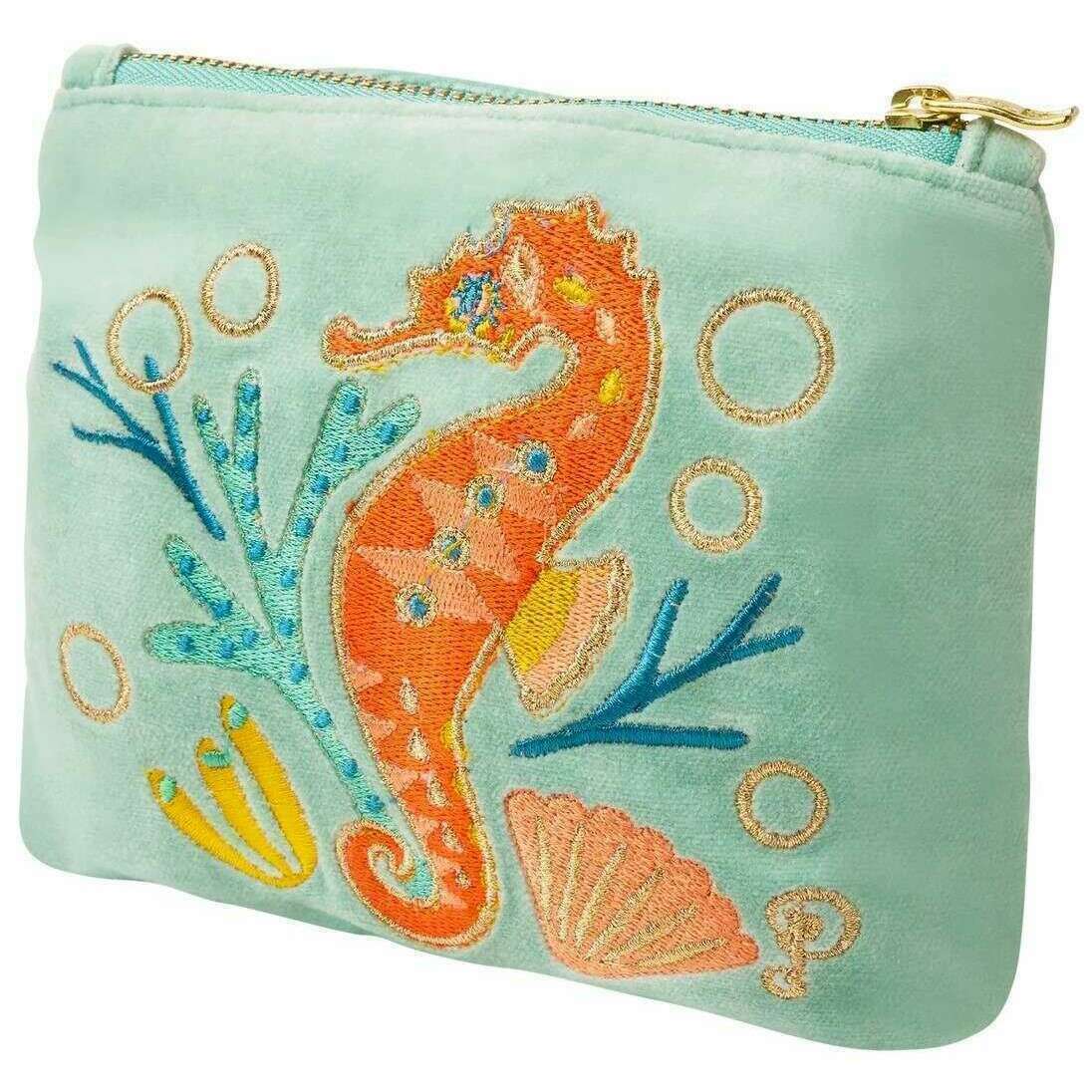 Powder Sparkling Seahorse Velvet Mini Pouch - Aqua Blue