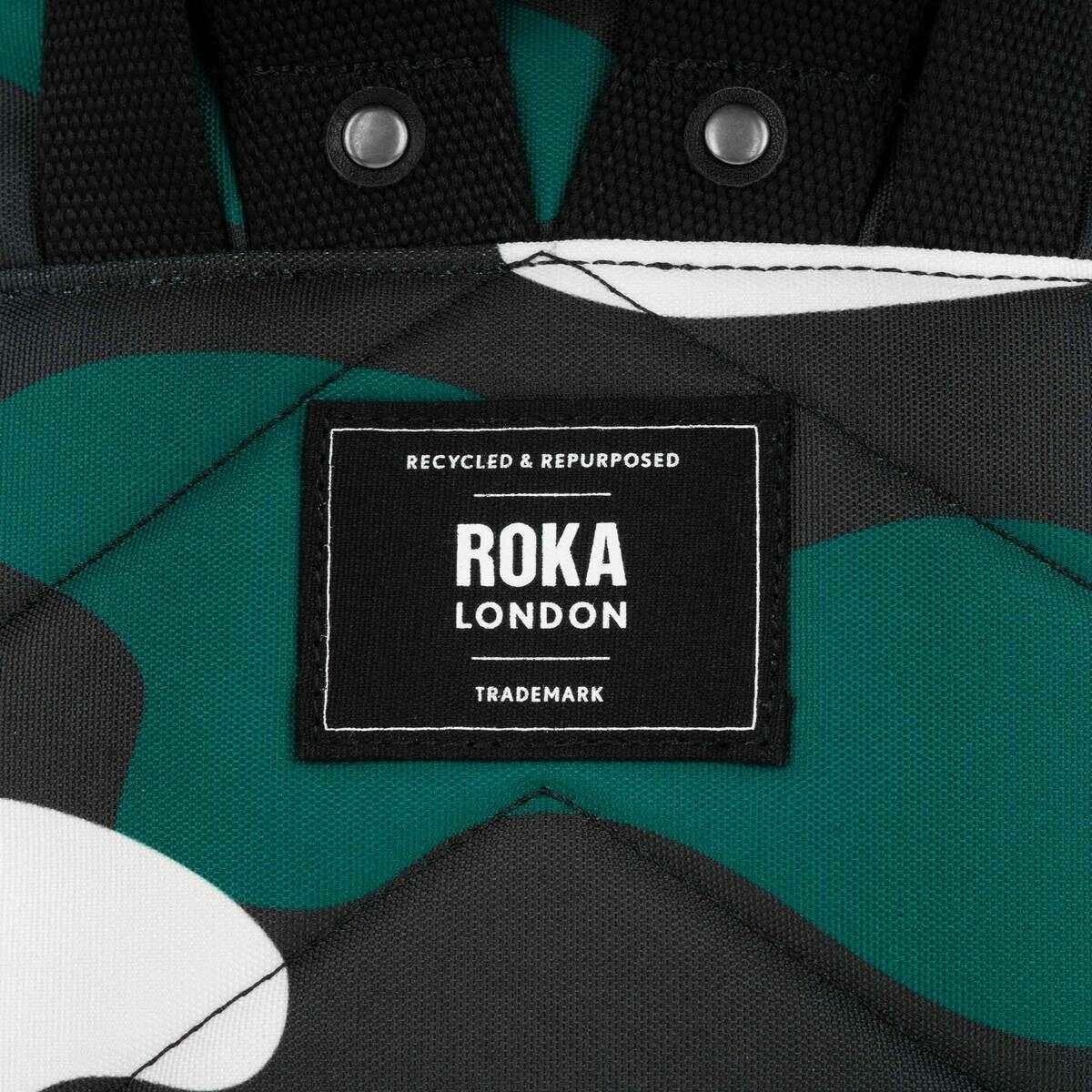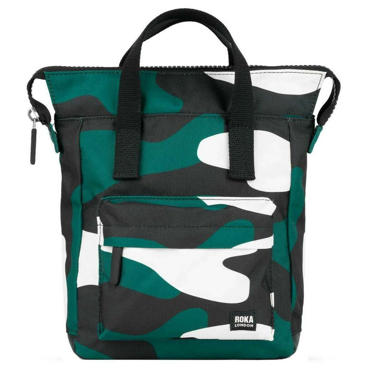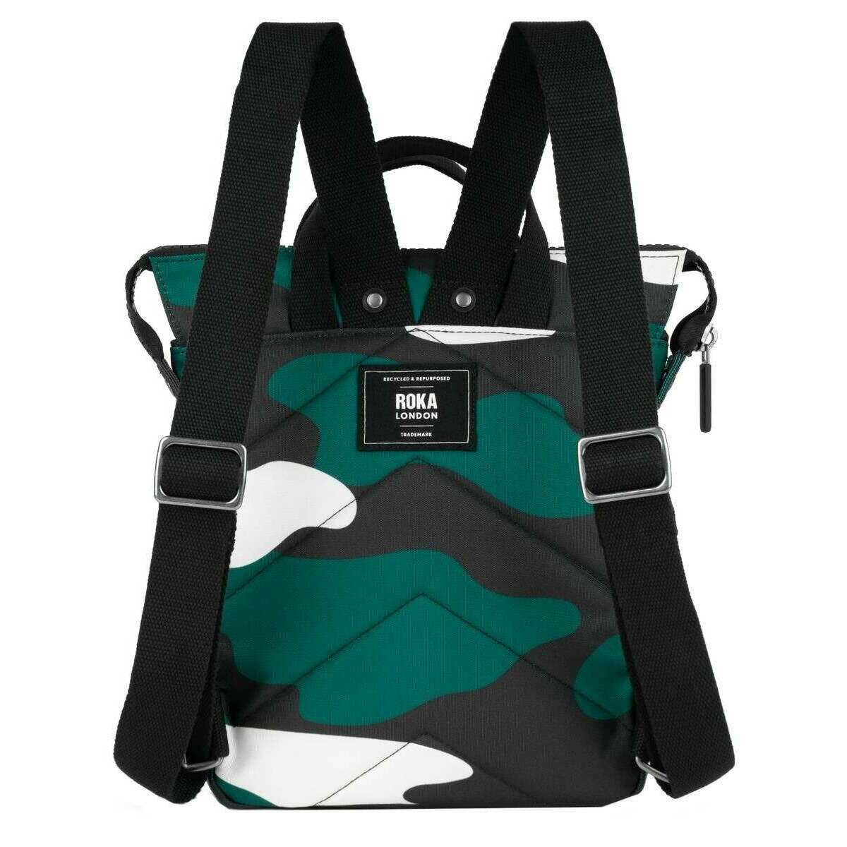 This unisex bantry b small urban rose camo recycled canvas backpack by the brand Roka is made from 100% weather resistant recycled canvas (triple coated) and is showcased in green. It measures 32cm(height) x 23cm(width) x 10cm(depth). Also the green/white/black bag is designed in a camouflage pattern, All the bags come complete with roka packaging. The Roka Bantry B Small Urban Rose Camo Recycled Canvas Backpack - Green/White/Black has four straps which allows it to be carried on your back or by your side. This backpack is perfect for your daily needs as it features a zipped front pocket, secure inside pocket, and a padded pocket for your tablet/laptop. Crafted from recycled nylon that is used from post-consumer waste, which is recycled fibres, offcuts and repurposed material, it is also lightweight and smooth as well as sustainable. Vegan friendly and water-resistant, it is the ultimate choice of backpack.