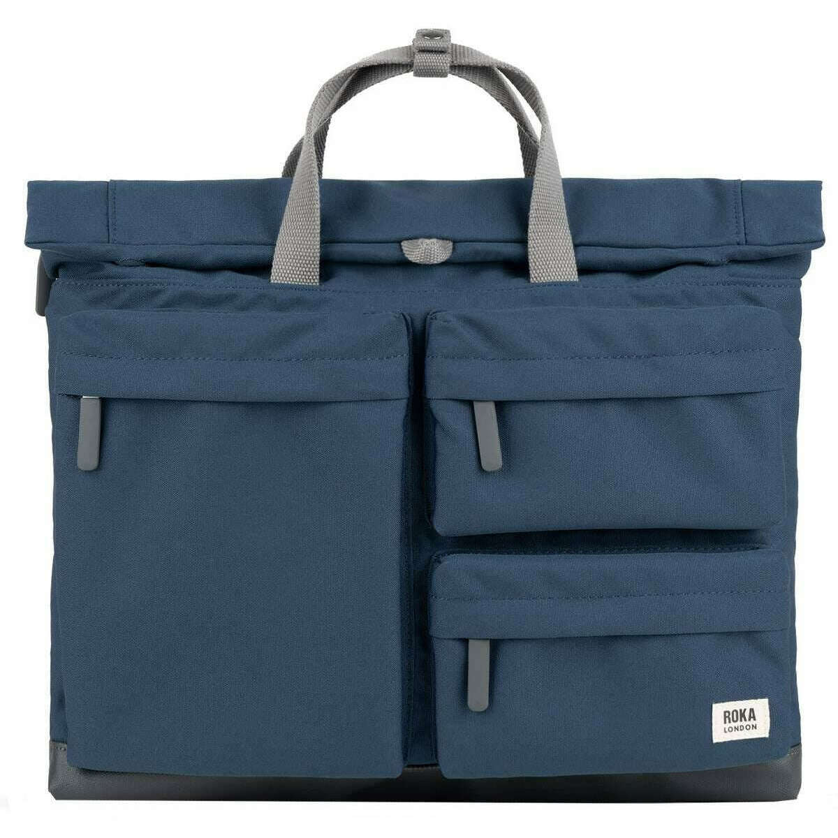 Manufactured from 100% weather resistant recycled canvas (triple coated) is this deep blue unisex blackfriars m large recycled canvas messenger bag by the designer Roka. It measures 41cm(height) x 32cm(width) x 12.5cm(depth). All the bags come complete with roka packaging. The Roka Blackfriars M Large Recycled Canvas Messenger Bag - Deep Blue incorporate all the features needed for your endeavors. This roll top messenger boasts three convenient front zip pockets and a spacious main compartment for all your essential items. Thanks to the use of recycled canvas, this bag is built to last, standing up to the wear and tear of daily use. Its lightweight design and adjustable straps also ensure comfort during long periods of use. Whether for everyday use or special occasions, this bag is a durable and responsible addition to any wardrobe.
