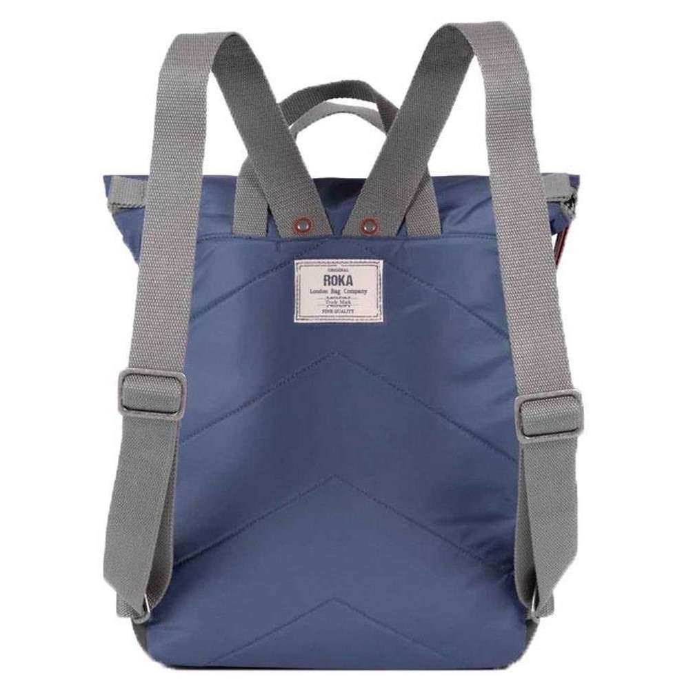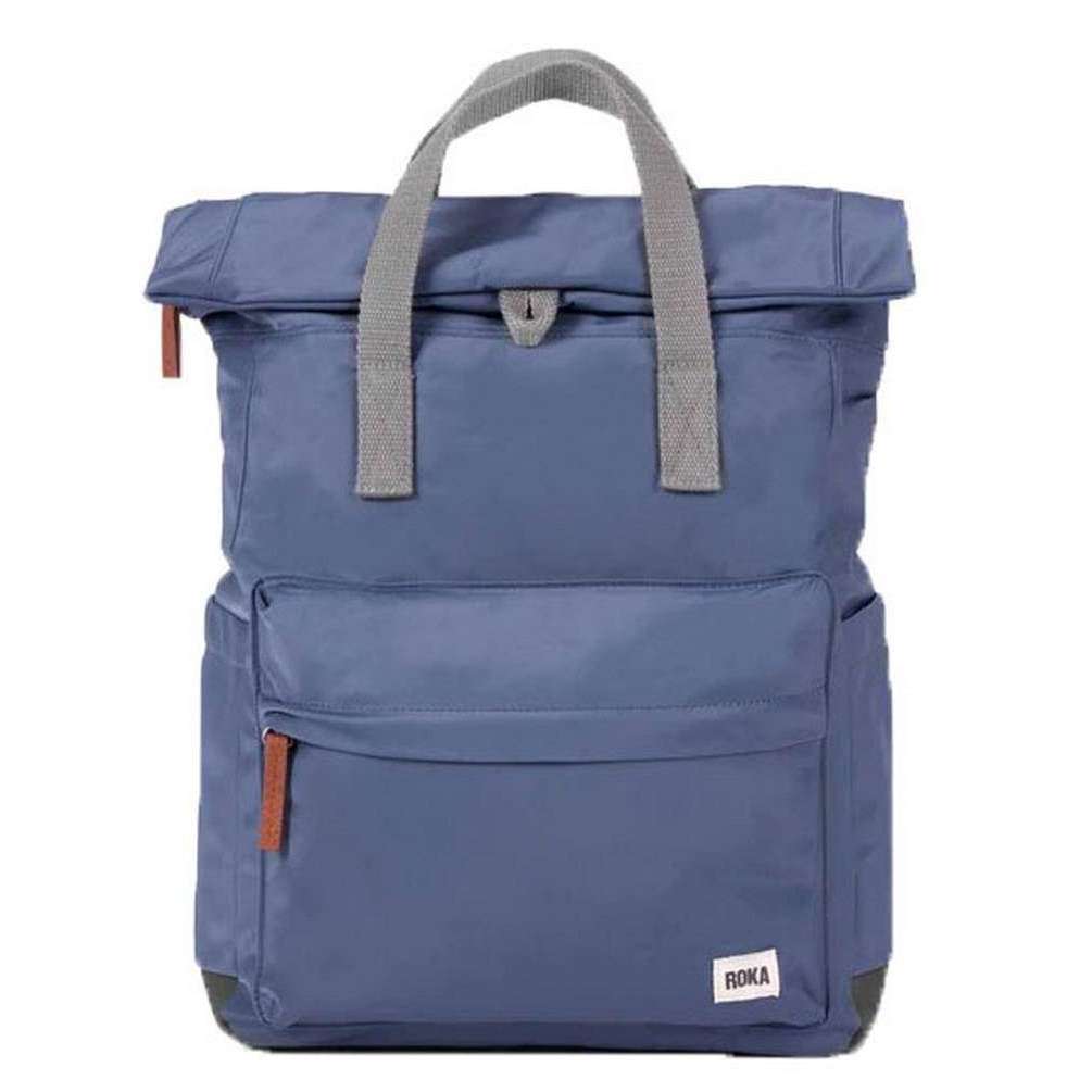 This unisex canfield b medium sustainable nylon backpack by the brand Roka is made from 100% weather resistant recycled nylon (triple coated) and is showcased in blue. It measures 42cm(height) x 30cm(width) x 12cm(depth). All the bags come complete with roka packaging. The Roka Canfield B Medium Sustainable Nylon Backpack - Airforce Blue is weather-resistant, durable, lightweight and sleek. Excellently crafted from recycled rPET materials, 12 or more plastic bottles are used to create this backpack making it environmentally friendly and sustainable. The roll top design enables the backpack to have a wide mouth opening which is secured with a sturdy zip and magnetic hold, carrying your essentials couldn’t be safer. Featuring a secret wallet pocket, a padded 15” laptop compartment, two side pockets perfect for water bottles, this backpack allows you to carry everything you may need on your day-to-day travels. Carry in complete comfort with the adjustable cotton webbing straps or the twin carry handles. This bag is completely vegan.