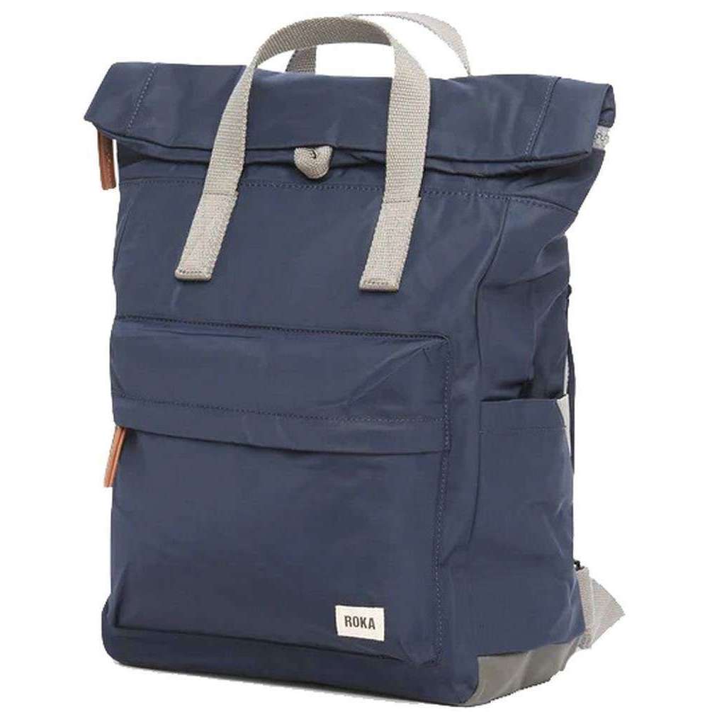 This unisex canfield b small sustainable nylon backpack by the brand Roka is made from 100% weather resistant recycled nylon (triple coated) and is showcased in navy. It measures 32cm(height) x 23.5cm(width) x 9.6cm(depth). All the bags come complete with roka tags. The Roka Canfield B Small Sustainable Nylon Backpack - Midnight Blue is weather-resistant, durable, lightweight and sleek. The roll top design enables the backpack to have a wide mouth opening which is secured with a sturdy zip and magnetic hold, carrying your essentials couldn’t be safer. Featuring a secret wallet pocket and a tablet section, this backpack allows you to carry everything you may need on your day-to-day travels. Carry in complete comfort with the adjustable cotton webbing straps or the twin carry handles. 12 or more plastic bottles are used to make the rPET material for this bag so it is environmentally friendly and also completely vegan.
