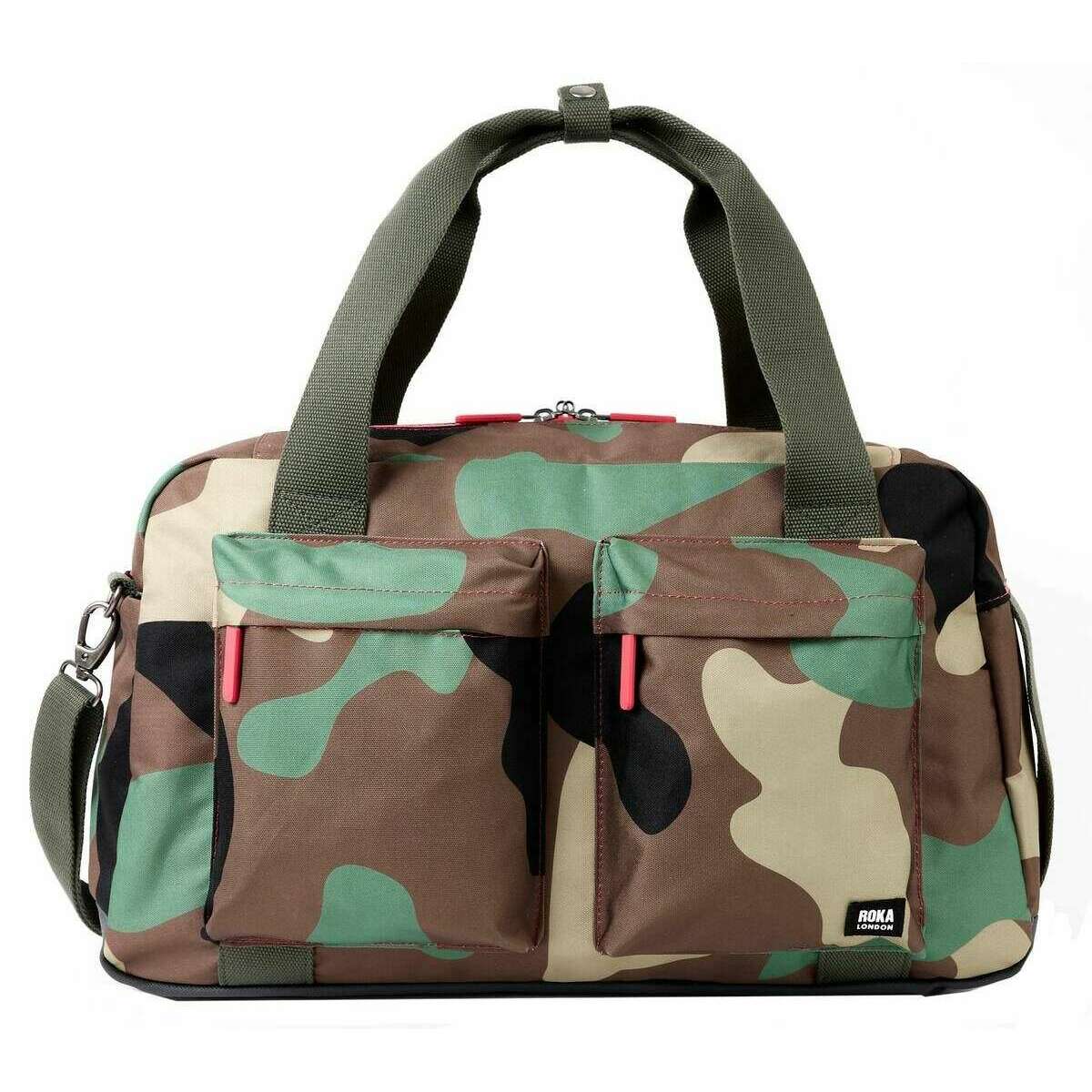 This unisex gatwick medium recycled canvas duffle bag by the brand Roka is made from 100% recycled canvas (triple-coated) and is showcased in green. It measures 30cm(height) x 51cm(width) x 21.5cm(depth). All the bags come complete with roka packaging. The Roka Gatwick Medium Recycled Canvas Duffle Bag - Vintage Camo Green is the ultimate travel companion as it features multi-functional straps and an array of pockets, keeping all your belongings organised on the move. Named after one of the busiest airports in the UK, it has been crafted with precision and style. Expertly crafted from recycled materials ensures this duffle is vegan and environmentally friendly as well has being water-resistant. Being able to fit in over head compartments, it is ideal for those shorter trips, and it features top handles, detachable shoulder strap, side grab handle, trolley sleeve, a waterproof pocket, padded laptop compartment that is accessible from the outside and one large main compartment. The perfect bag for stylish travel.