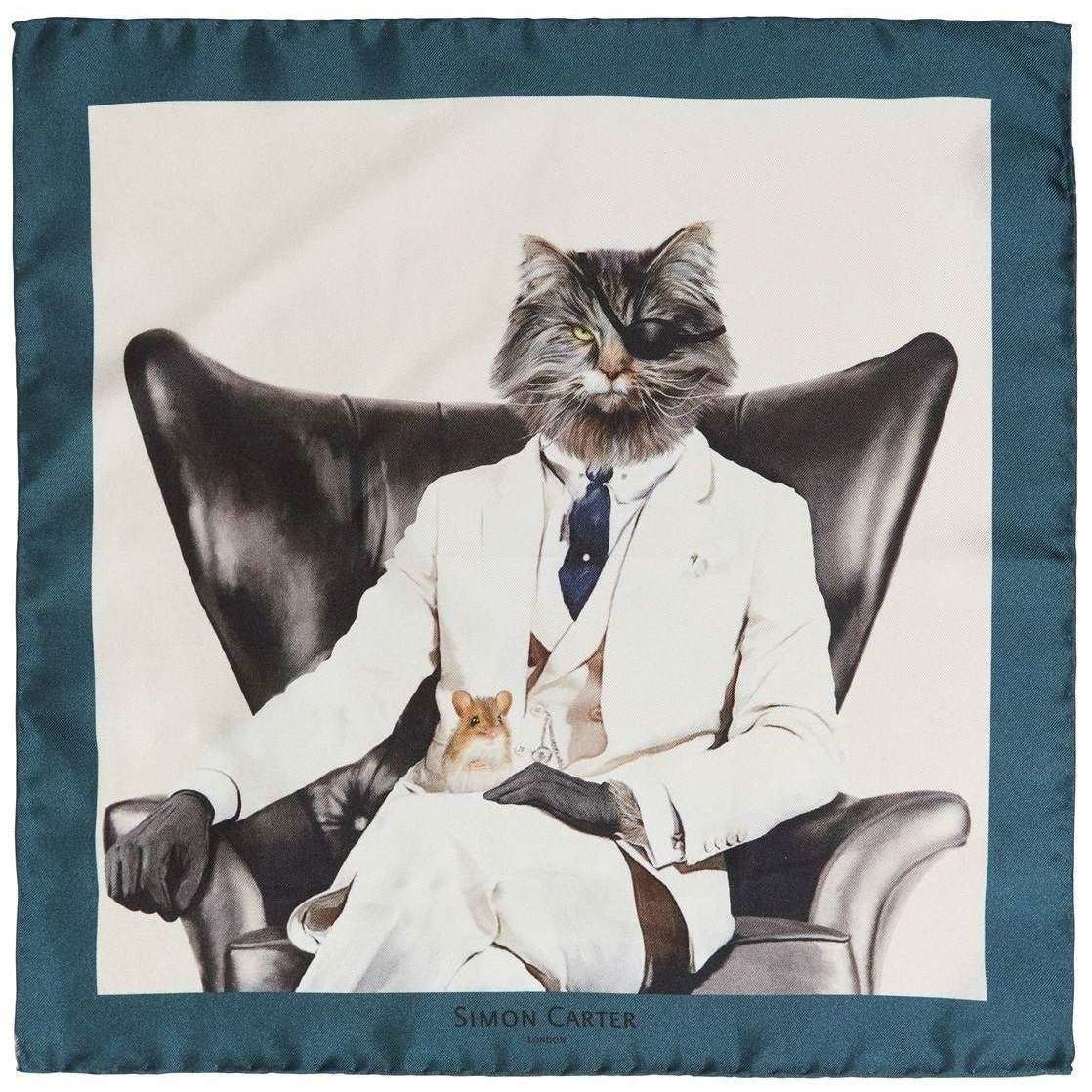 This men's evil cat pocket square has been made from 100% silk, featured in a blue colour and is from the brand Simon Carter. It measures 30cm(height) x 30cm(width). All the handkerchiefs come complete with simon carter tags. The Simon Carter Evil Cat Pocket Square - Blue/White will surely liven up your formal attire with its standout design and vibrant colour choices. Silky soft to the touch, it is a high-quality accessory that no suit jacket should go without and has been crafted with the finest materials to ensure it will impress.