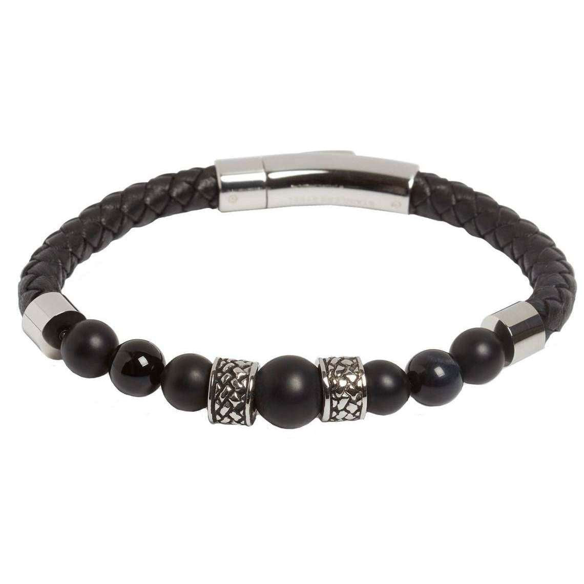 Manufactured from leather, onyx and stainless steel is this black/silver men's jacob bracelet by the designer Simon Carter. All the bracelets come complete in a simon carter presentation box. The Simon Carter Jacob Bracelet - Black/Silver consists of a woven leather strap as well as matte and polished onyx beads to create a sophisticated and sleek accessory. Featuring a precision trigger clasp, this luxurious bracelet also has shiny metal sections and makes an excellent finishing touch to casual/smart outfits. Crafted with the finest materials to a high standard.