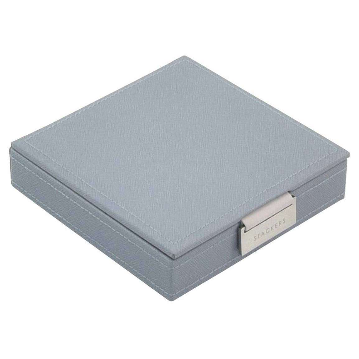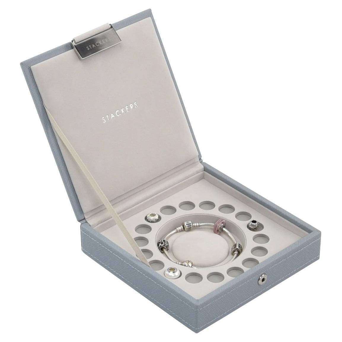 This well made women's charm box from Stackers comes in a dusky blue/grey colour and is manufactured from pu with velvet. It measures 3.5cm(height) x 15cm(width) x 15cm(depth). All the jewellery boxes come complete in stackers packaging. The Stackers Charm Box - Dusky Blue/Grey would make the perfect gift to any woman with a charm bracelet. This box can hold up to 18 charms and your bracelet in a flawless organised design. With a metal popper closure, this is easy to travel with, keeping everything safe and secure in one place.