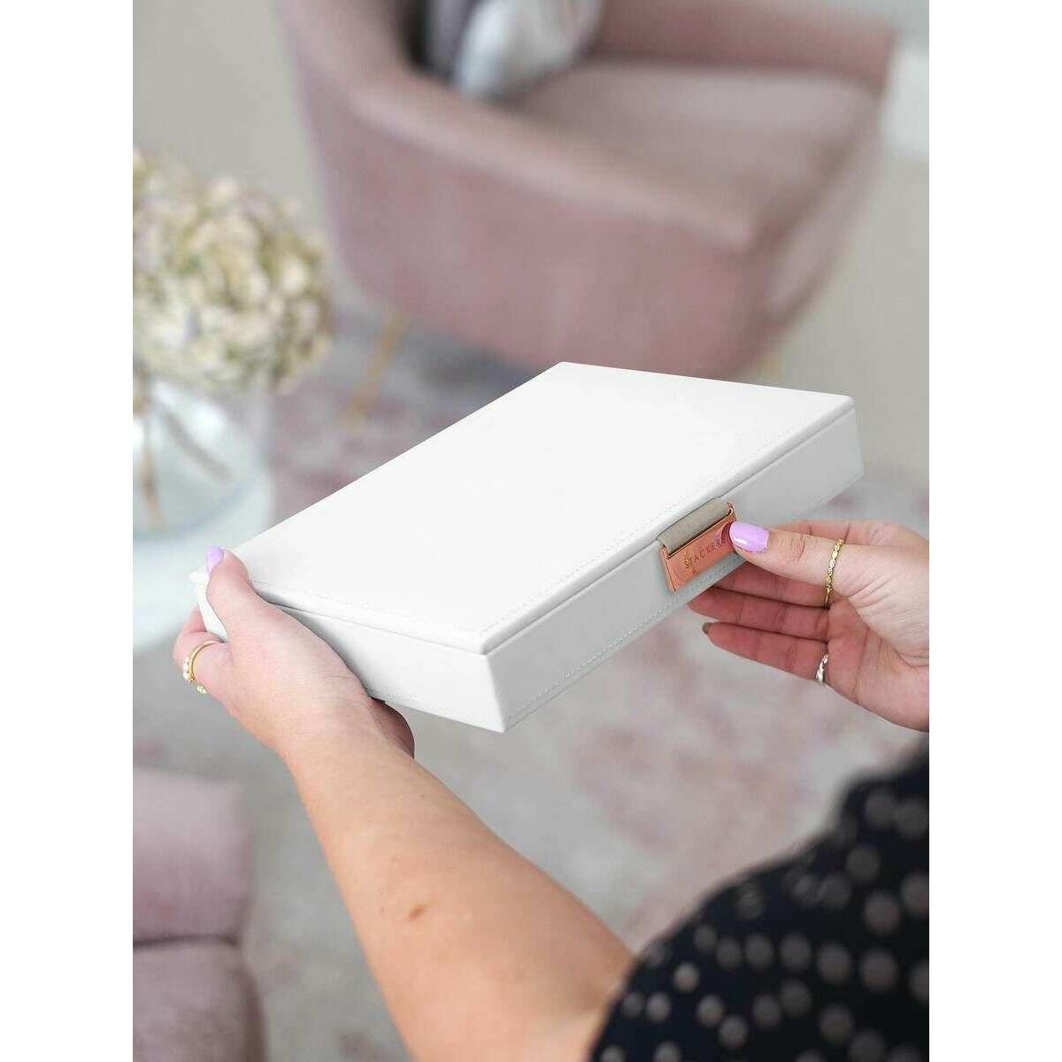 Introducing this women's classic bracelet jewellery box lid by Stackers, it is manufactured from faux leather and velvet in a white and rose gold colour. It measures 4.2cm(height) x 25cm(width) x 18cm(depth). It is recommended to wipe clean to keep this jewellery box in good condition. All the jewellery boxes come complete with stackers packaging. The Stackers Classic Bracelet Jewellery Box Lid - White and Rose Gold is the perfect starter piece or can be used as a stand-alone to sit elegantly on your side table or vanity. The lidded design offers secure protection for your loved jewellery and offers luxurious organisation, keeping everything in one place. It features 2 bracelet pads, a long open section, ideal for necklaces and pendants, a removeable charm bar as well as additional sections for all your smaller jewellery.