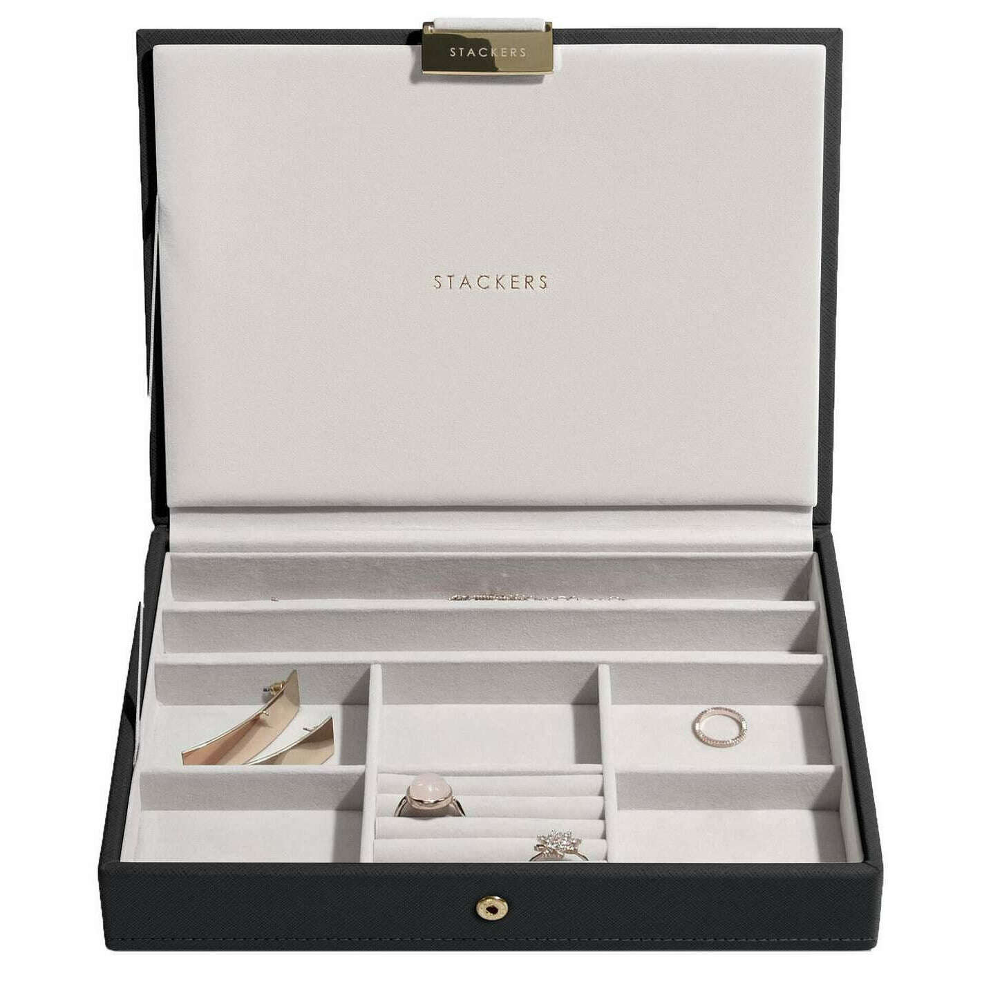 Introducing this women's classic set of 4 jewellery box by Stackers, it is manufactured from faux leather and velvet in a black raffia colour. It measures 19.5cm(height) x 25cm(width) x 18cm(depth). All the jewellery boxes come complete with stackers packaging. The Stackers Classic Set of 4 Jewellery Box - Black Raffia features a unique black raffia jewellery box design. This jewellery box is perfect for storing all your jewellery items! Comes complete with four layers and multiple sized sections for earrings, rings and bracelets and a larger section for watches and bangles.