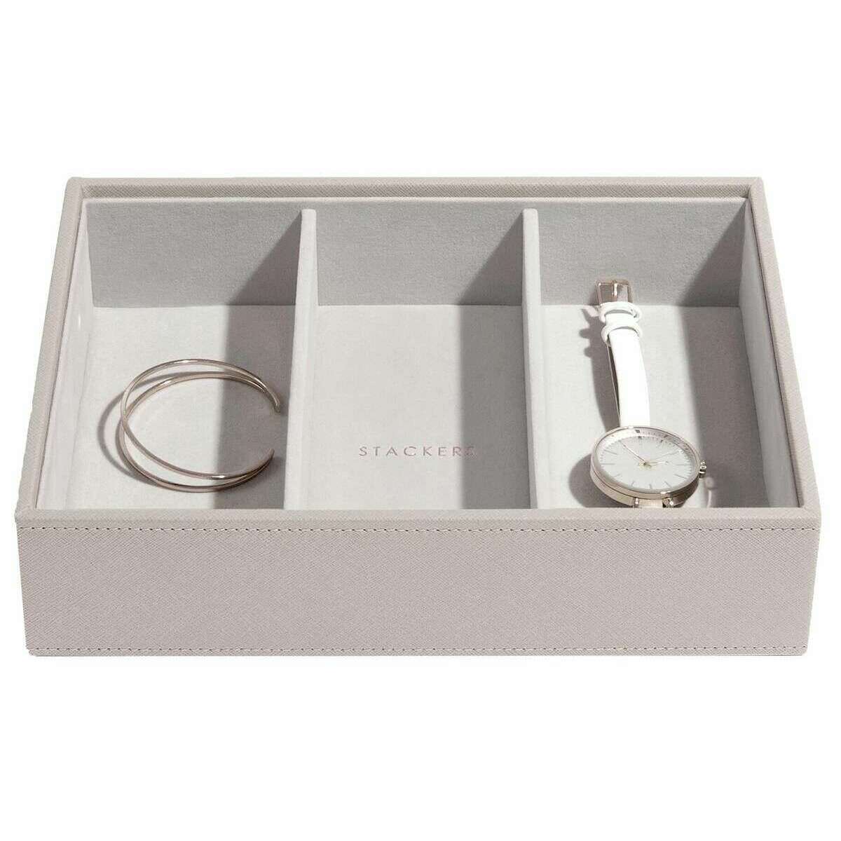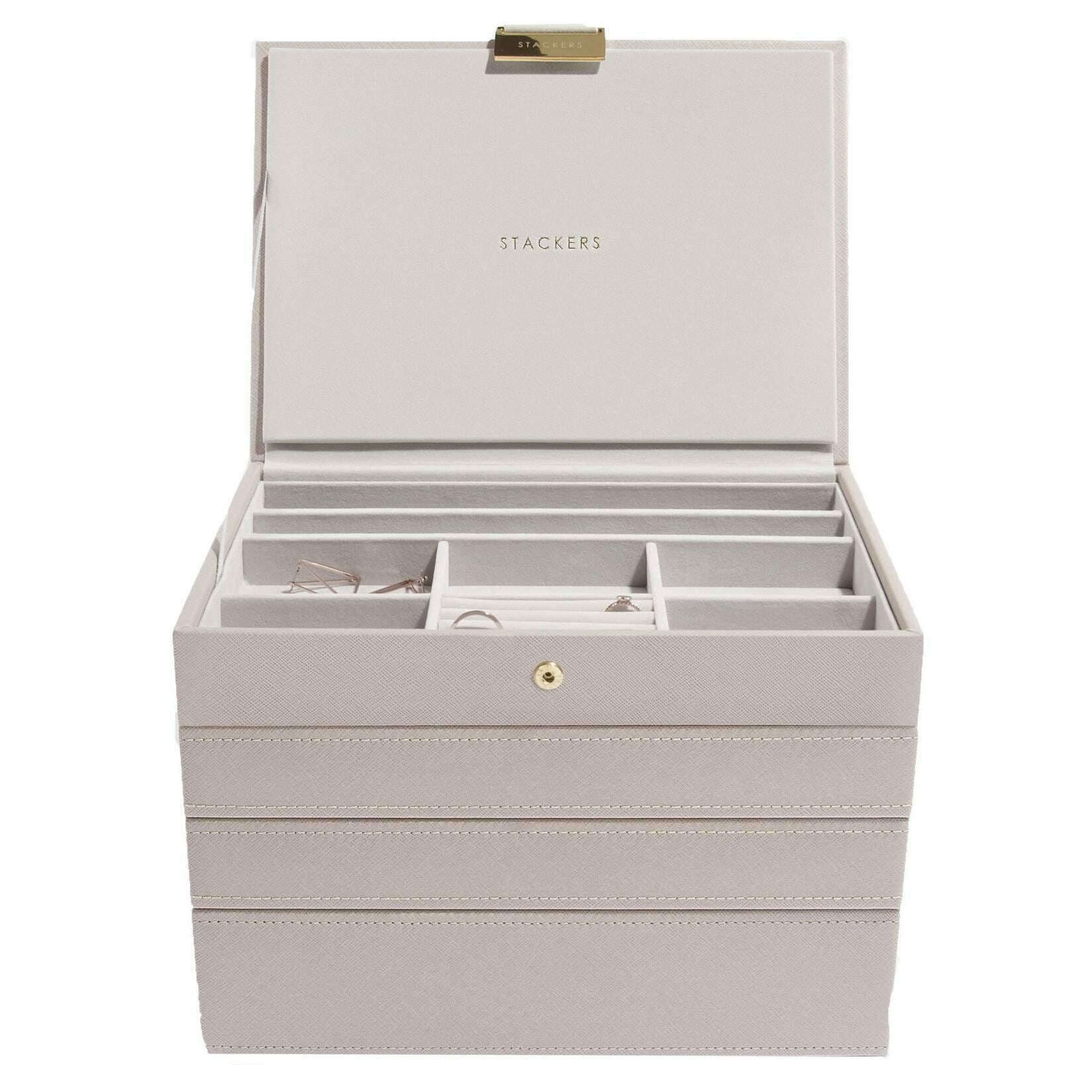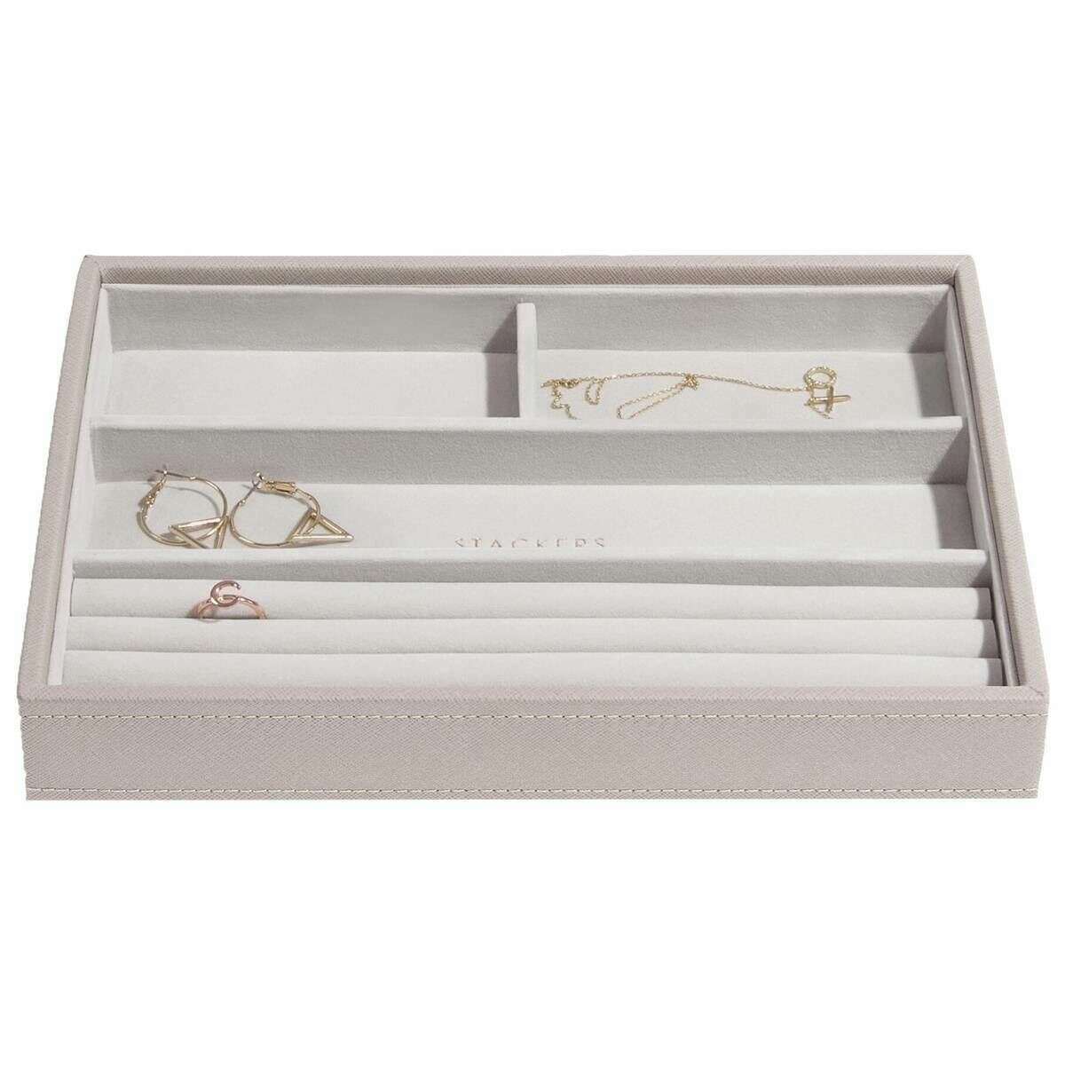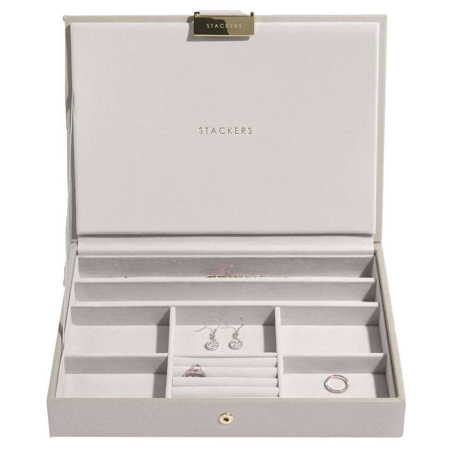 Designer Stackers has brought you this women's faux leather and velvet jewellery box using taupe raffia tones. It measures 19.5cm(height) x 25cm(width) x 18cm(depth). All the jewellery boxes come complete with stackers packaging. The Stackers Classic Set of 4 Jewellery Box - Taupe Raffia features a unique taupe raffia jewellery box design. This jewellery box is perfect for storing all your jewellery items! Comes complete with four layers and multiple sized sections for earrings, rings and bracelets and a larger section for watches and bangles.