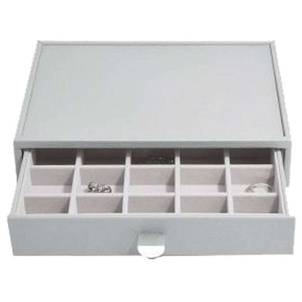 Manufactured from faux leather and velvet is this pebble grey women's classic trinket drawer by the designer Stackers. It measures 18cm(height) x 25cm(width) x 5.6cm(depth). All the jewellery boxes come complete in stackers packaging. The Stackers Classic Trinket Drawer - Pebble Grey will make a great addition to your existing stackers jewellery box or as a stand-alone drawer as it is just as elegant solo. Ideal for storing all of your much-loved jewellery pieces and crafted to a high level of quality to ensure durability and an all-round amazing jewellery organiser. Every woman needs elegant storage for their valuables, concealing them and keeping them safe with style.