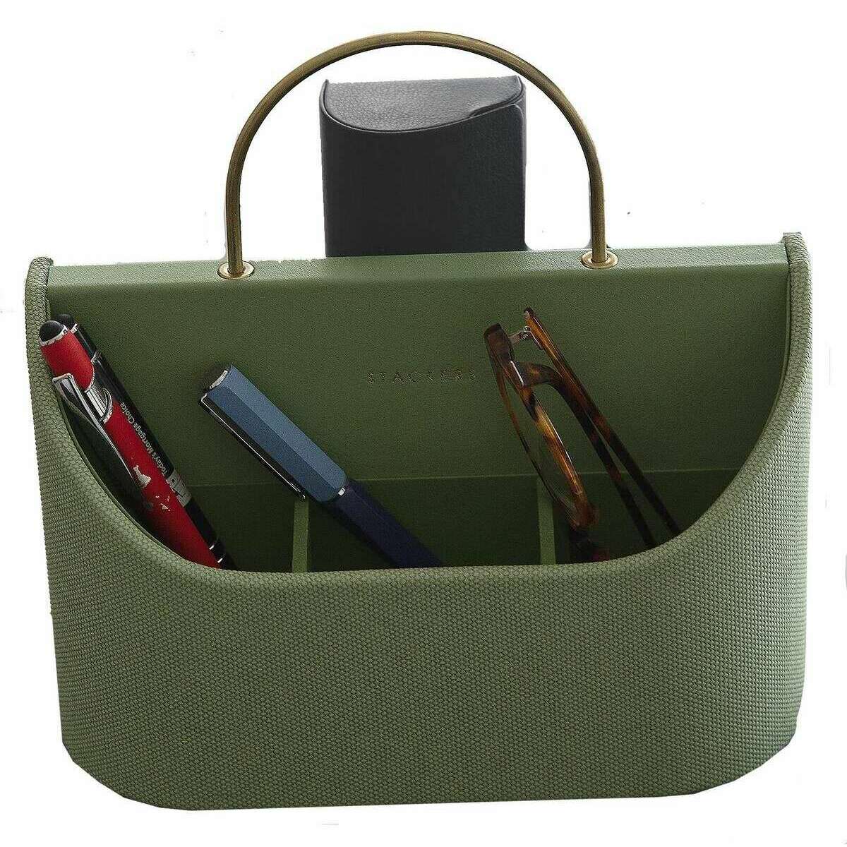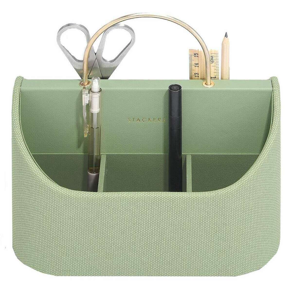 Manufactured from faux leather is this pistachio green women's desk caddy by the designer Stackers. It measures 21cm(height) x 21cm(width) x 13cm(depth). All the desk accessories come complete with stackers packaging. The Stackers Desk Caddy - Pistachio Green is a must have for any desk! This green desk caddy is perfect for storing stationary and even has a handle which makes it easily portable.