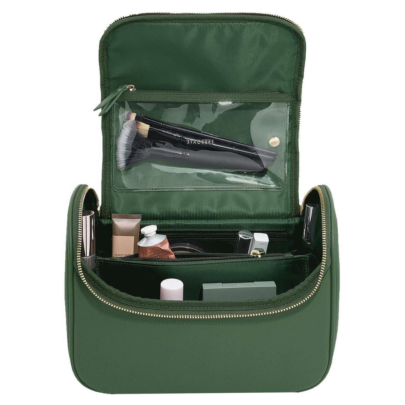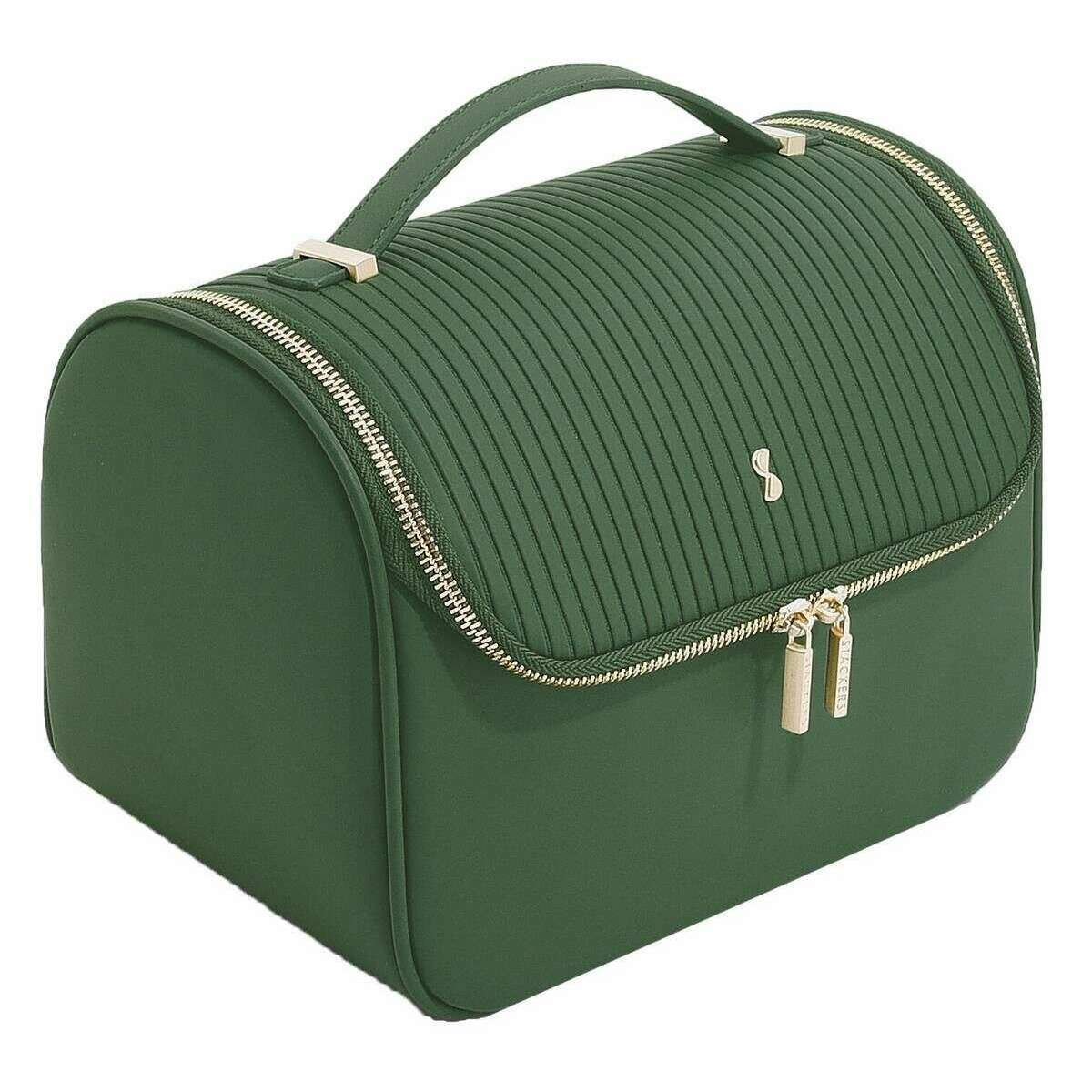 Manufactured from faux leather and nylon is this emerald green women's large cosmetic case by the designer Stackers. It measures 18cm(height) x 28cm(width) x 15cm(depth). All the bags come complete with stackers packaging. The Stackers Large Cosmetic Case - Emerald Green is a must have when on the go! This green large cosmetic case is perfect for keeping tidy whilst carrying lots of products. Includes a zip closure and a stackers mini mirror.