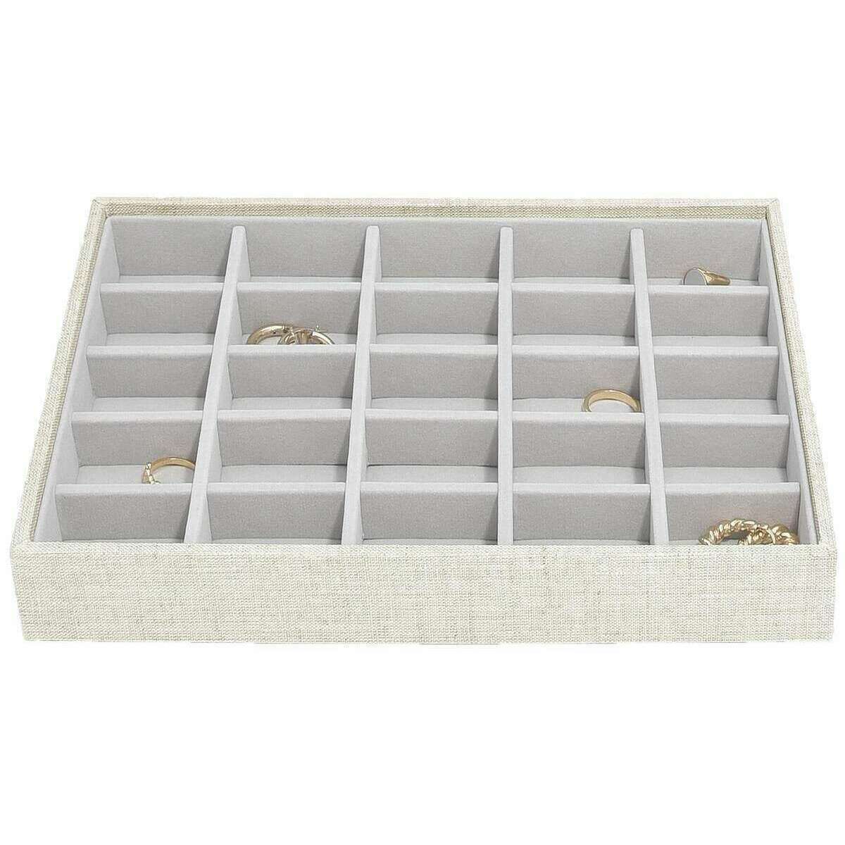 Using beige faux leather and linen, this set of 5 classic jewellery box by Stackers is perfect for women and a must have. It measures 24.2cm(height) x 25cm(width) x 18cm(depth). All the jewellery boxes come complete in stackers packaging. The Stackers Set of 5 Classic Jewellery Box - Oatmeal/Linen Beige will be certain to impress with its unbelievable amount of space. Featuring a top lidded section for those precious little pieces, a middle 25 section tray for those charms or rings, another middle tray with three sections to hold your bracelets and necklaces with ring rolls to store more rings and earrings, and then one of the bottom trays is a deep three section box for those larger items like big bracelets, watches and sunglasses and the last bottom tray is a deep open box for large items that need extra space. Make this the most ideal jewellery box you can own with it offering so much in the most luxurious way.
