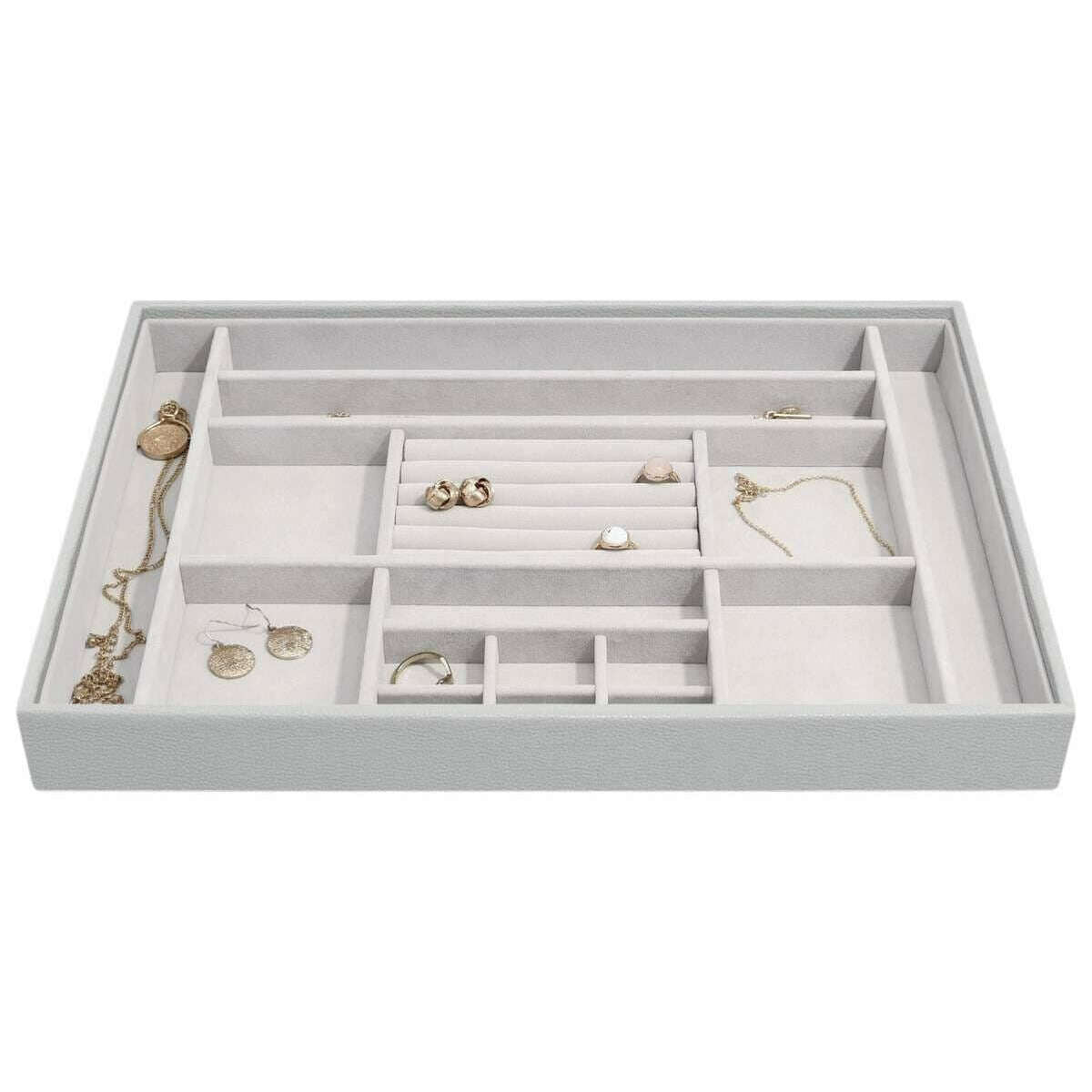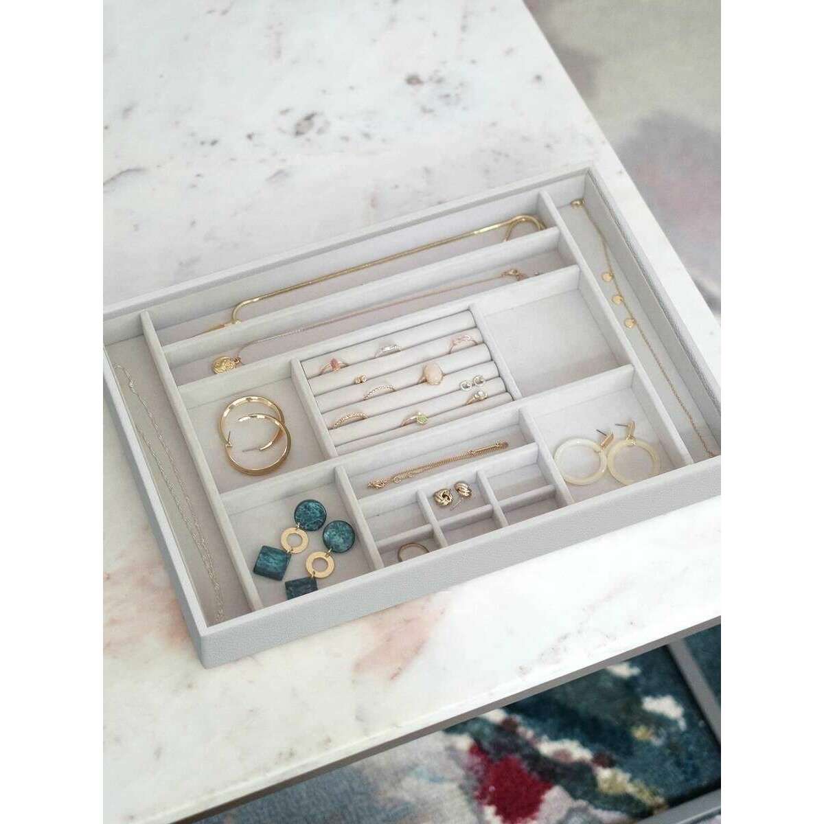 Using grey faux leather and velvet, this supersize ring accessory layer by Stackers is perfect for women and a must have. It measures 4cm(height) x 36cm(width) x 23.9cm(depth). It is recommended to wipe clean to keep this jewellery box in good condition. All the jewellery boxes come complete with stackers packaging. The Stackers Supersize Ring Accessory Layer - Pebble Grey offers you the option to stack this with other supersize layers from the stackers collection to create your own custom jewellery box suitable for your needs. Alternatively, it can be used alone to organise your rings, bracelets and other small accessories. Expertly crafted with high quality materials, this lovely layer would be perfect for those who love to accessorise.