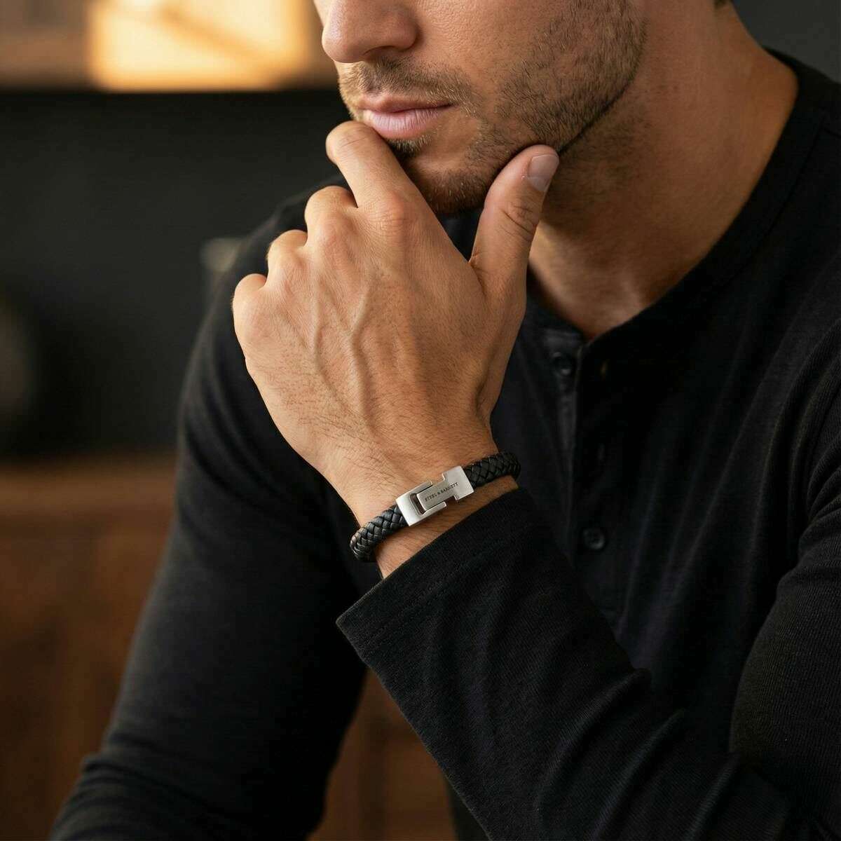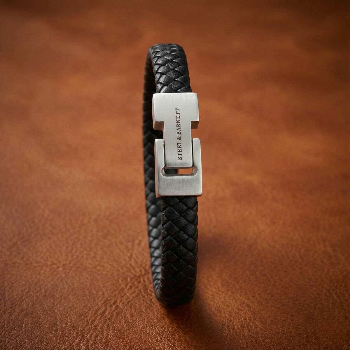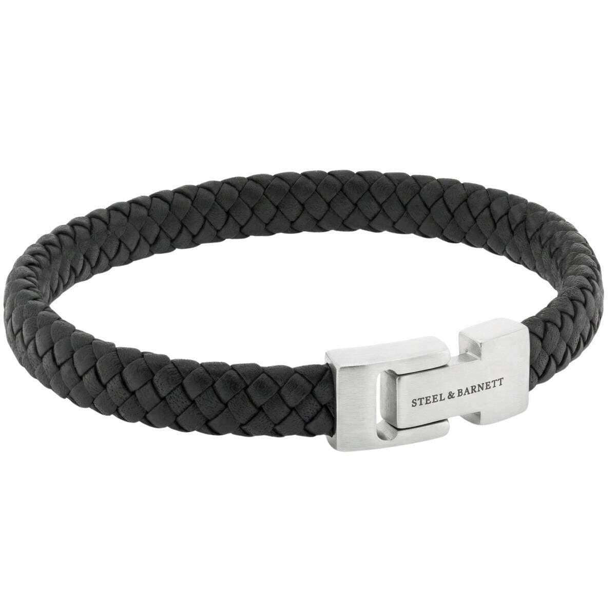 This men's archie braided leather bracelet by the brand Steel & Barnett is made from 100% nappa leather and stainless steel and is showcased in black. All the bracelets come complete with steel & barnett packaging. The Steel & Barnett Archie Braided Leather Bracelet - Black embodies the perfect balance of simplicity and elegance. Expertly hand crafted from genuine Nappa leather, its smooth 8mm band delivers a clean, minimalist aesthetic suitable for any style. The design is elevated by a signature brushed silver clasp, finely engraved with the STEEL & BARNETT logo, offering a subtle touch of distinction. Built for longevity, the bracelet features a high?grade 316L stainless steel clasp, celebrated for its durability and corrosion resistance. Its magnetic fastening ensures effortless wear, providing a secure and comfortable fit throughout the day. Versatile and refined, the Archie transitions seamlessly from formal occasions to casual settings, adding a layer of understated sophistication to every outfit.