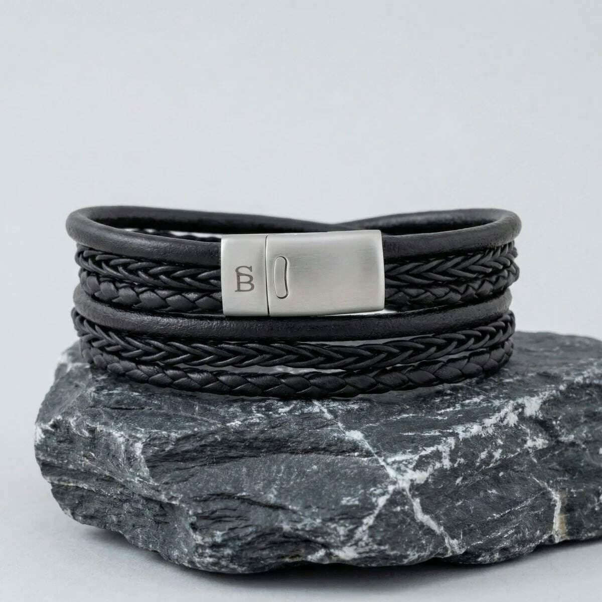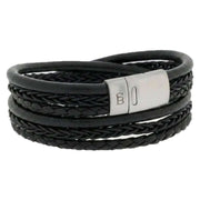 This men's bonacci layered multi-strand leather bracelet by the brand Steel & Barnett is made from 100% cowhide leather and stainless steel and is showcased in black. All the bracelets come complete with steel & barnett packaging. The Steel & Barnett Bonacci Layered Multi-Strand Leather Bracelet - Black is a refined expression of craftsmanship and timeless style. Handcrafted from fine?grade genuine cowhide leather, each strand is meticulously braided to create a rich, layered texture that speaks to both quality and sophistication. Its 12 mm width offers a bold yet versatile presence, making it suitable for everyday wear or elevated occasions. The bracelet is finished with a brushed steel clasp, engineered from 316L stainless steel for exceptional durability and resistance to corrosion. Its magnetic clasp design ensures effortless fastening while maintaining a secure, comfortable fit throughout the day. Elegant, durable, and thoughtfully designed, the Bonacci bracelet is a standout accessory that complements modern style with a classic touch.