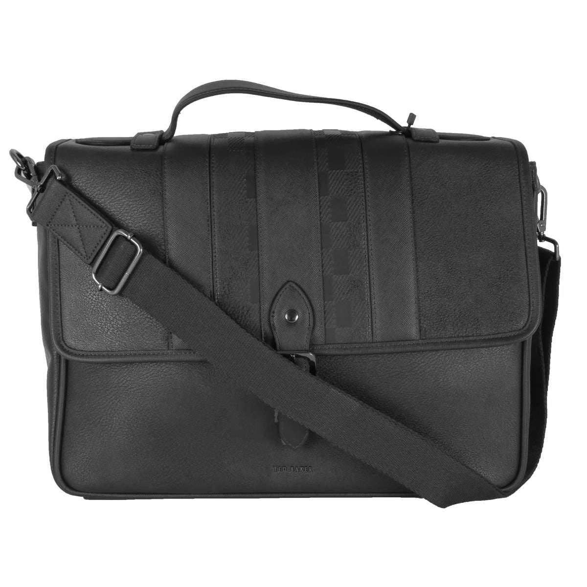 This men's wayvees house check satchel has been made from 100% polyurethane, featured in a black colour and is from the brand Ted Baker. It measures 29cm(height) x 39cm(width) x 11cm(depth). All the bags come complete with ted baker packaging. The Ted Baker Wayvees House Check Satchel - Black features two ways to carry it with the detachable strap and the top handle. This bag also comes with plenty of space for your most valuable items such as a separate pocket for your laptop and mobile phone. Perfect for business trips.