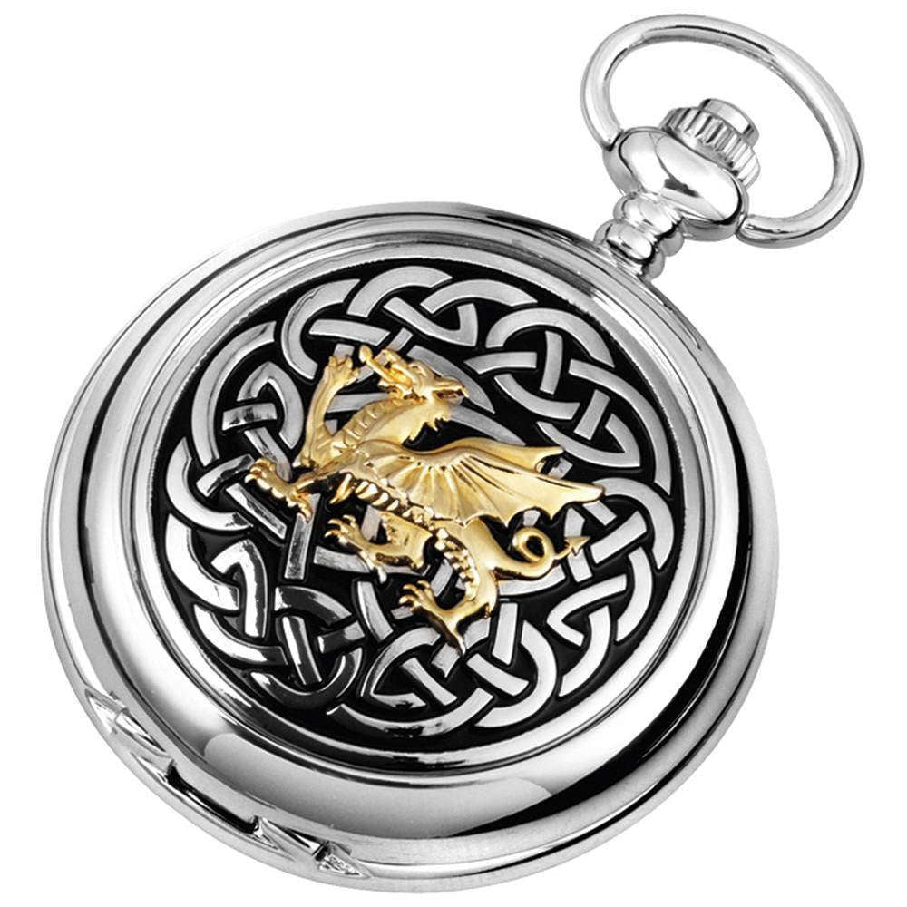 Woodford Celtic Dragon Chrome Plated Double Full Hunter Skeleton Pocket Watch - Silver/Gold/Black