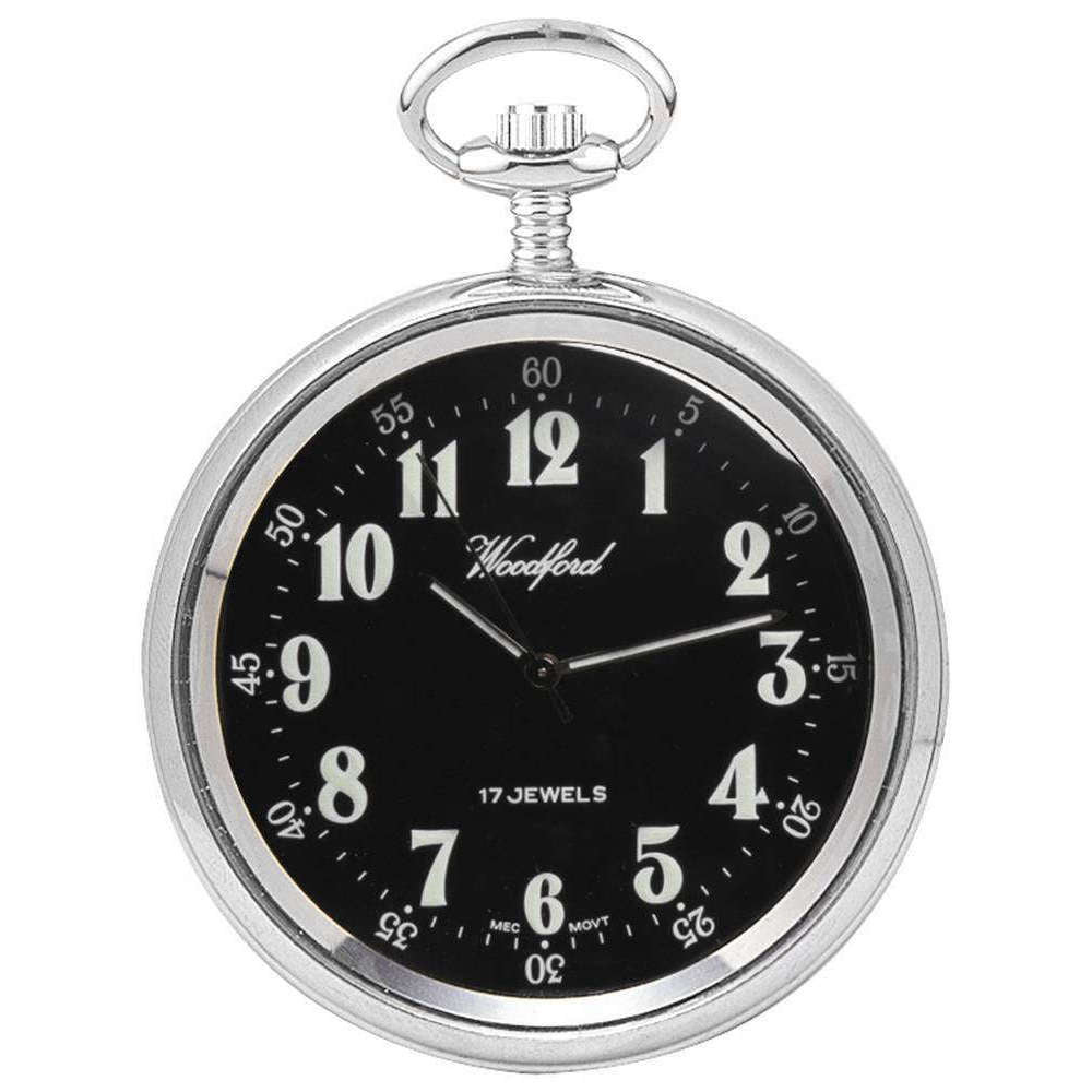Woodford Chrome Plated Arabic Open Face Mechanical Pocket Watch - Silver/Black