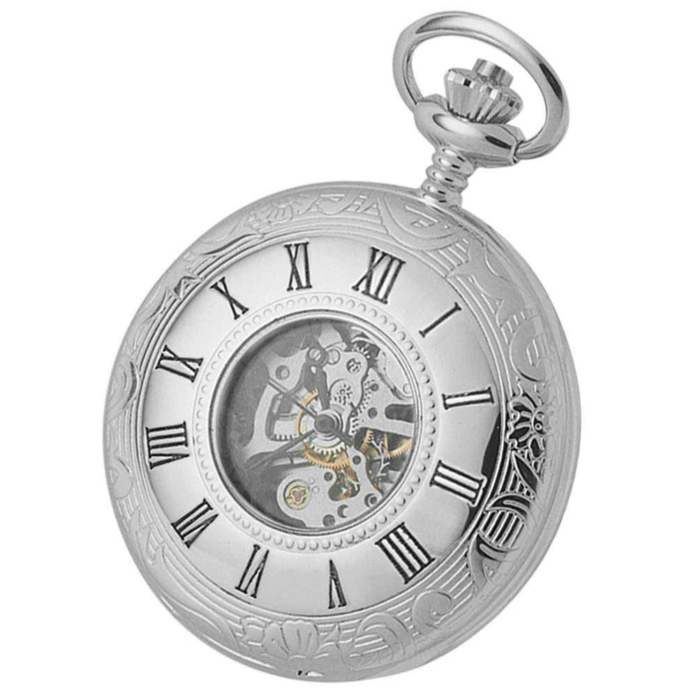 Woodford Chrome Plated Double Half Hunter Skeleton Spring Wound Pocket Watch - Silver