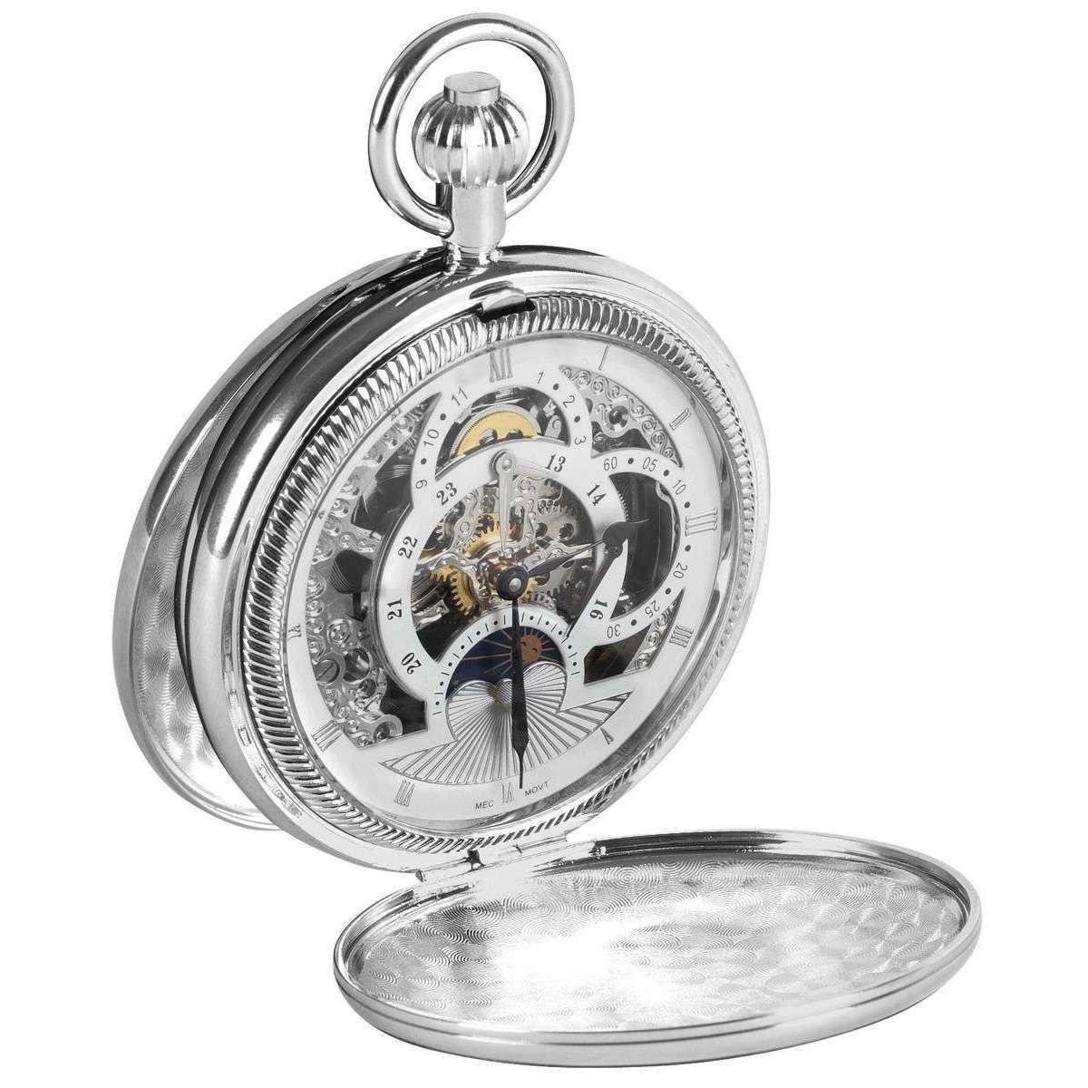 Woodford Chrome Plated Twin Time Zone Double Full Hunter Skeleton Mechanical Pocket Watch - Silver