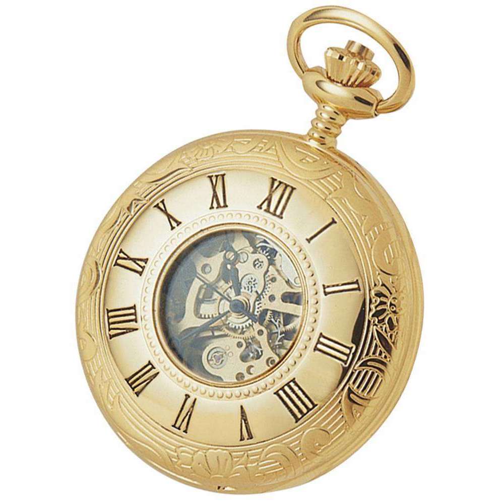 Woodford are renowned for their spectacular time pieces and this pocket watch is the perfect example as it has been magnificently crafted into a double half hunter style and features bold roman numerals on the outer chapter ring allowing you to tell the time without having to open up the case. Once inside the case you will see the skeleton mechanical movement, roman numerals and a minute indicator; it truly is an elegant piece. You can be certain of its fine quality and craftsmanship as it has been skilfully manufactured from only the finest of gold plate. Engraved with a glorious pattern and coming complete with an Albert chain and luxury packaging, this Woodford double half hunter spring wound pocket watch would make a glorious choice of gift.