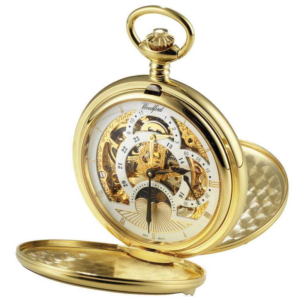 Woodford Gold Plated Twin Time Zone Double Full Hunter Skeleton Mechanical Pocket Watch - Gold