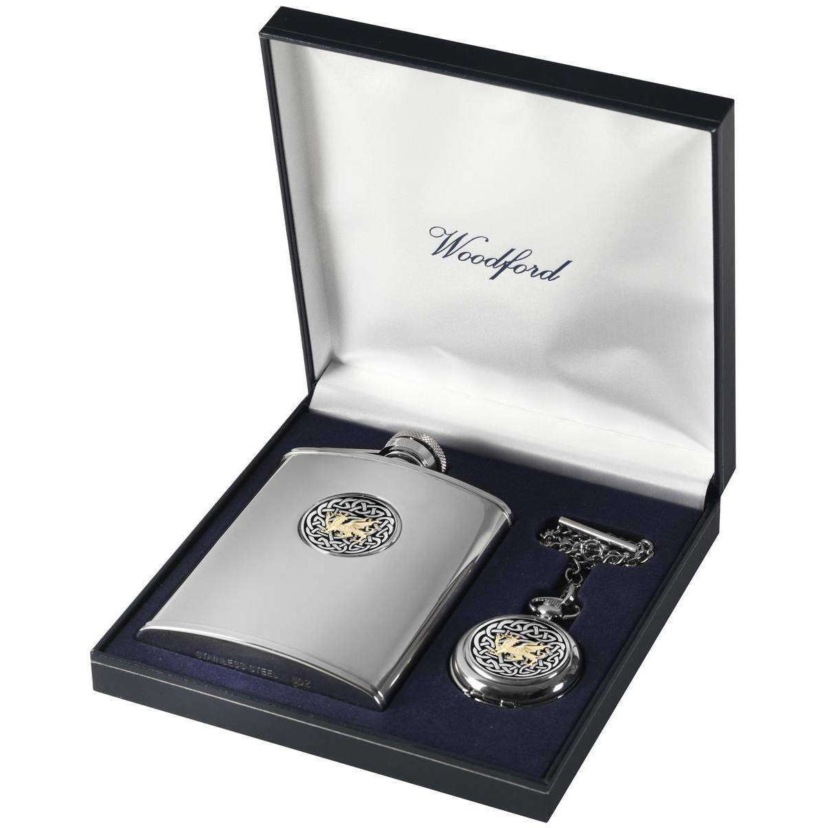 Woodford Welsh Dragon 6oz Hip Flask and Pocket Watch Set - Silver